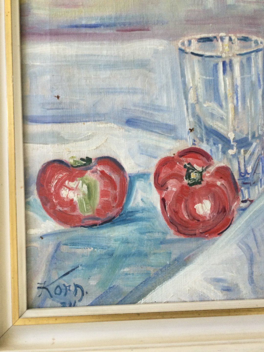 Text zugänglich auf Dänische: Maleri af H.J. Korn - Opstilling med blomstervase samt frugt 1934,