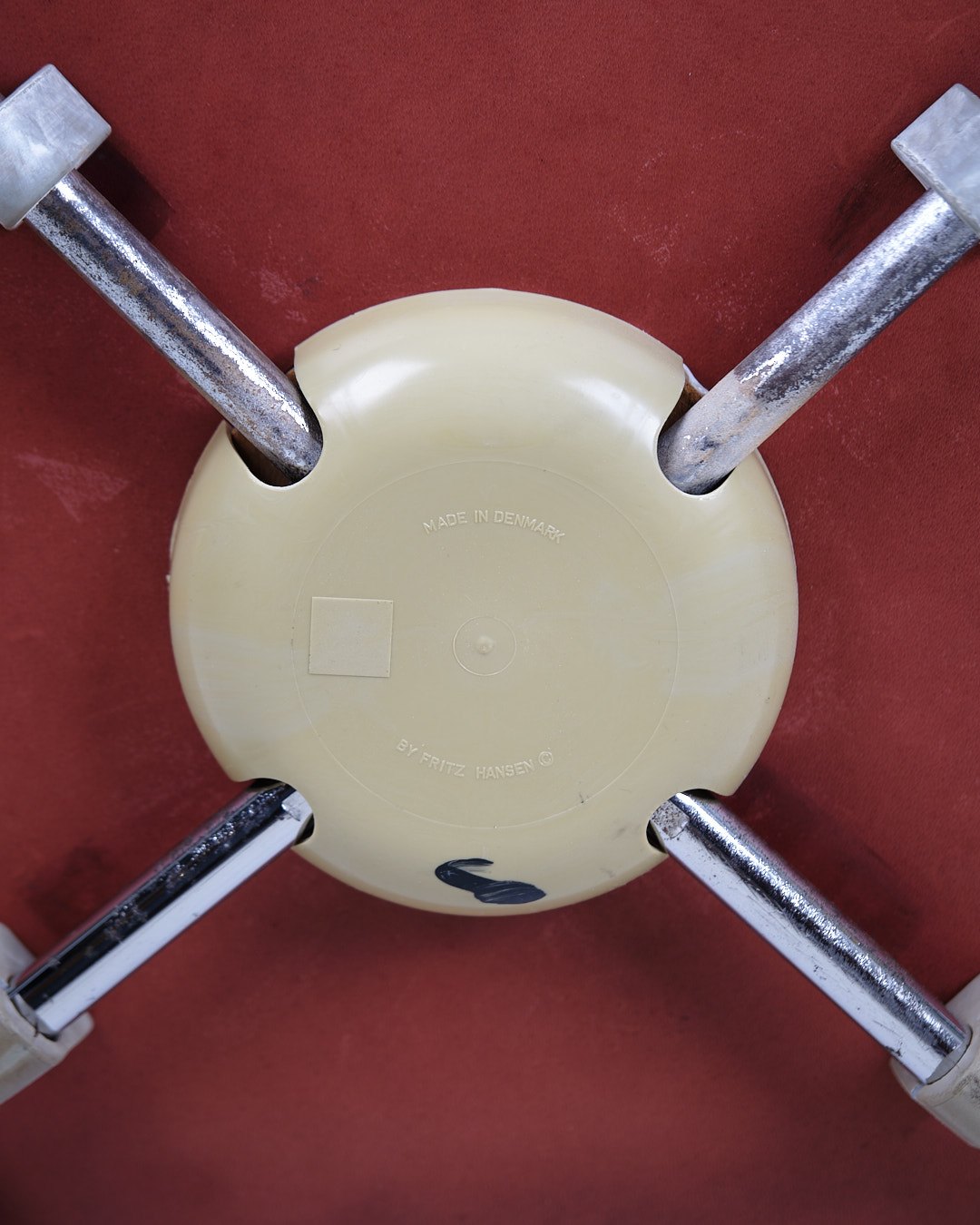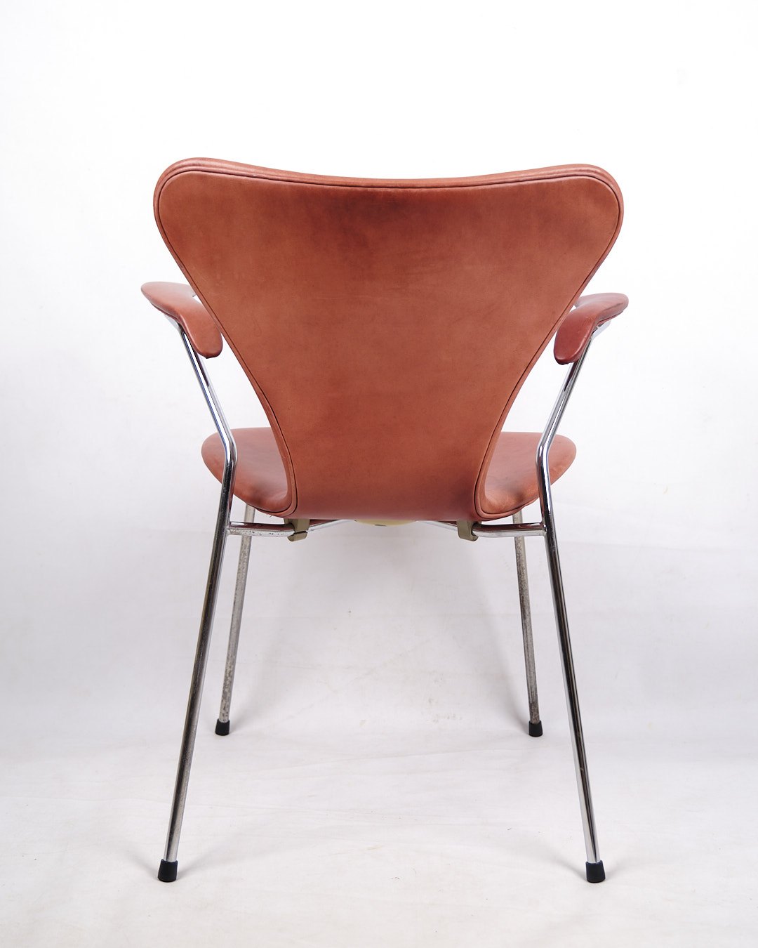 Text zugänglich auf Dänische: Arne Jacobsen Syverstol med armlæn, model 3207. Cognacfarvet læder og kromstel. Fritz Hansen designklassiker.