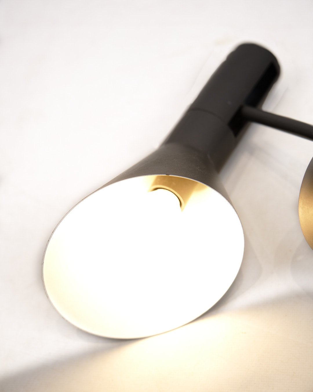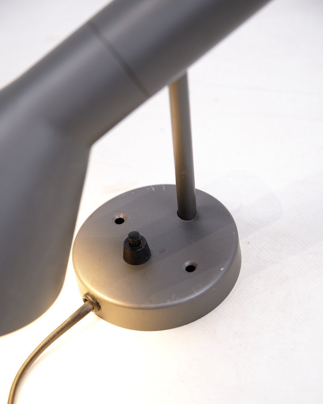 Text zugänglich auf Dänische: Sæt af to AJ væglamper i lys grå, designet af Arne Jacobsen i 1960’erne og produceret af Louis Poulsen. Lamperne er udført i pulverlakeret stål og har det karakteristiske skærmformede design, der giver både direkte og retningsbestemt lys.