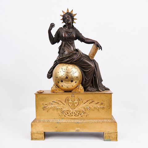 Text zugänglich auf Dänische: Fransk Kaminur - Bronze - Udsmykket Med Kvindefigur med strålekrone og bog - Paris - År 1820erne