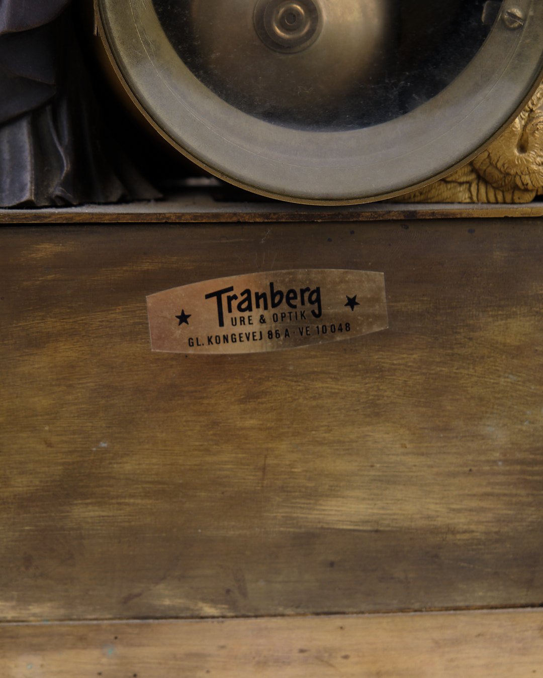 Text zugänglich auf Dänische: Fransk bronze kaminur fra 1820’erne. Empirestil med kvindefigur, strålekrone og bog. Elegant og velbevaret ur fra Paris.