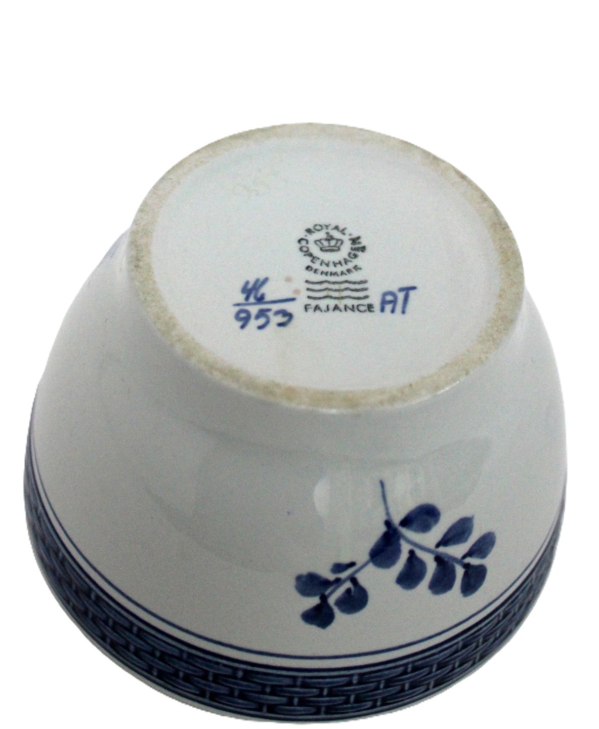 Text zugänglich auf Dänische: Royal Copenhagen, Tranquebar/Skibsstellet lyseblå fajance med mørkeblå tulipan og flettet bort designet af Christian Joachim. Håndmalet.