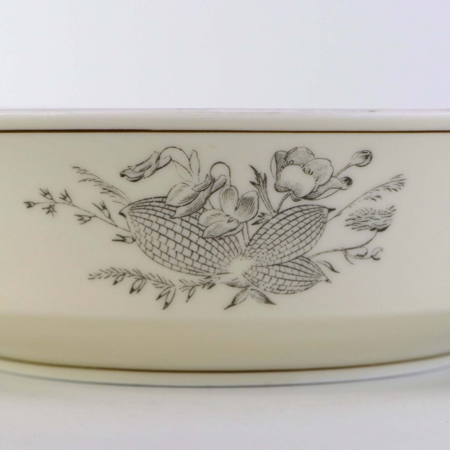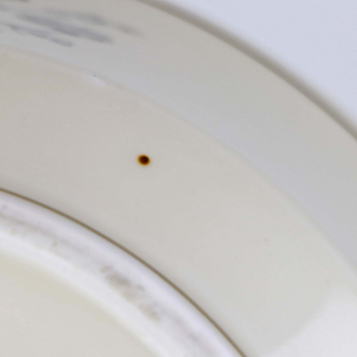 Fremstår med mindre ujævnhed i porcelæn på låget, brugsspor på skålens topkanten samt brun plet under glasuren under bunden af lågfadet.