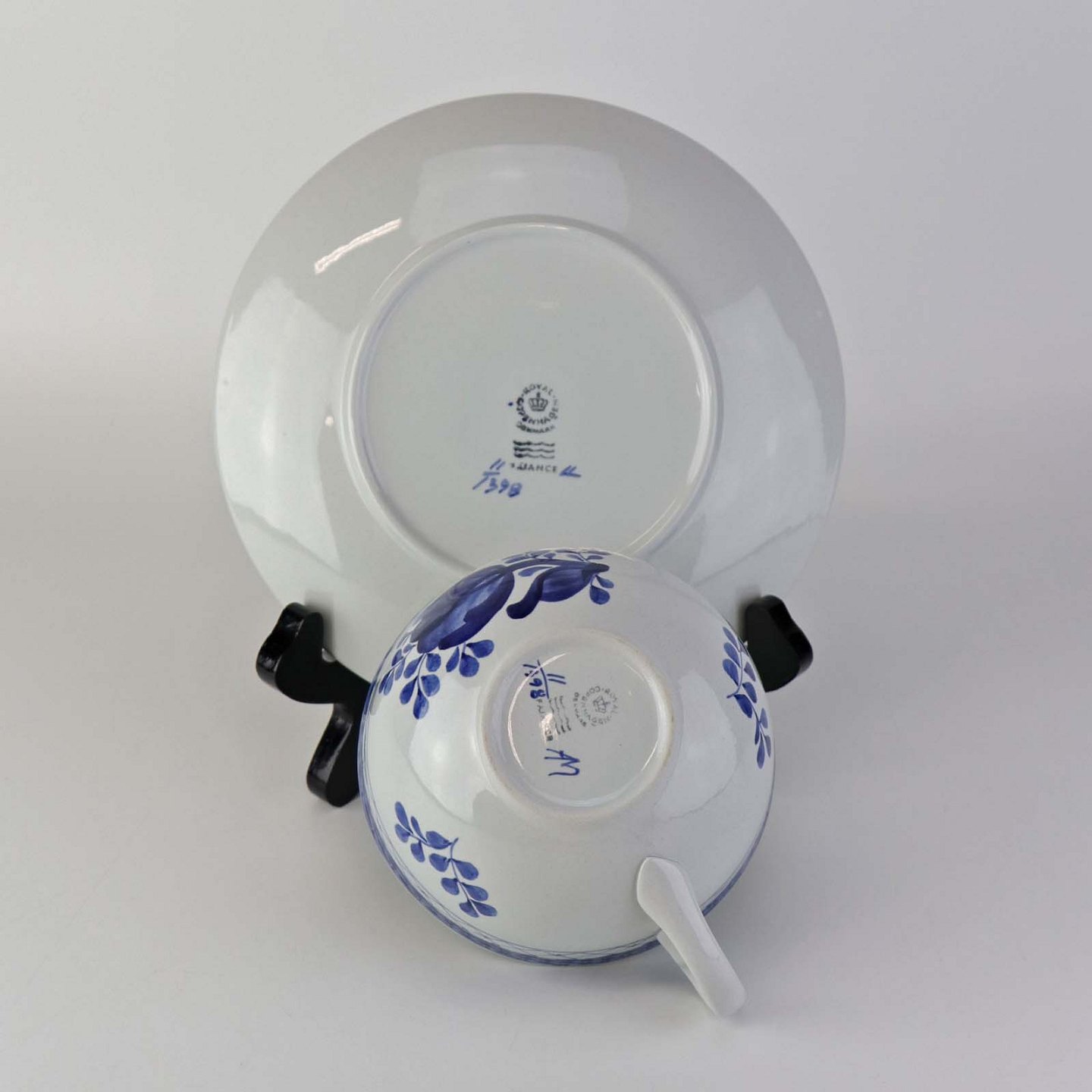 Glat Lyst fajance med blå dekoration af blomster og blå bort.