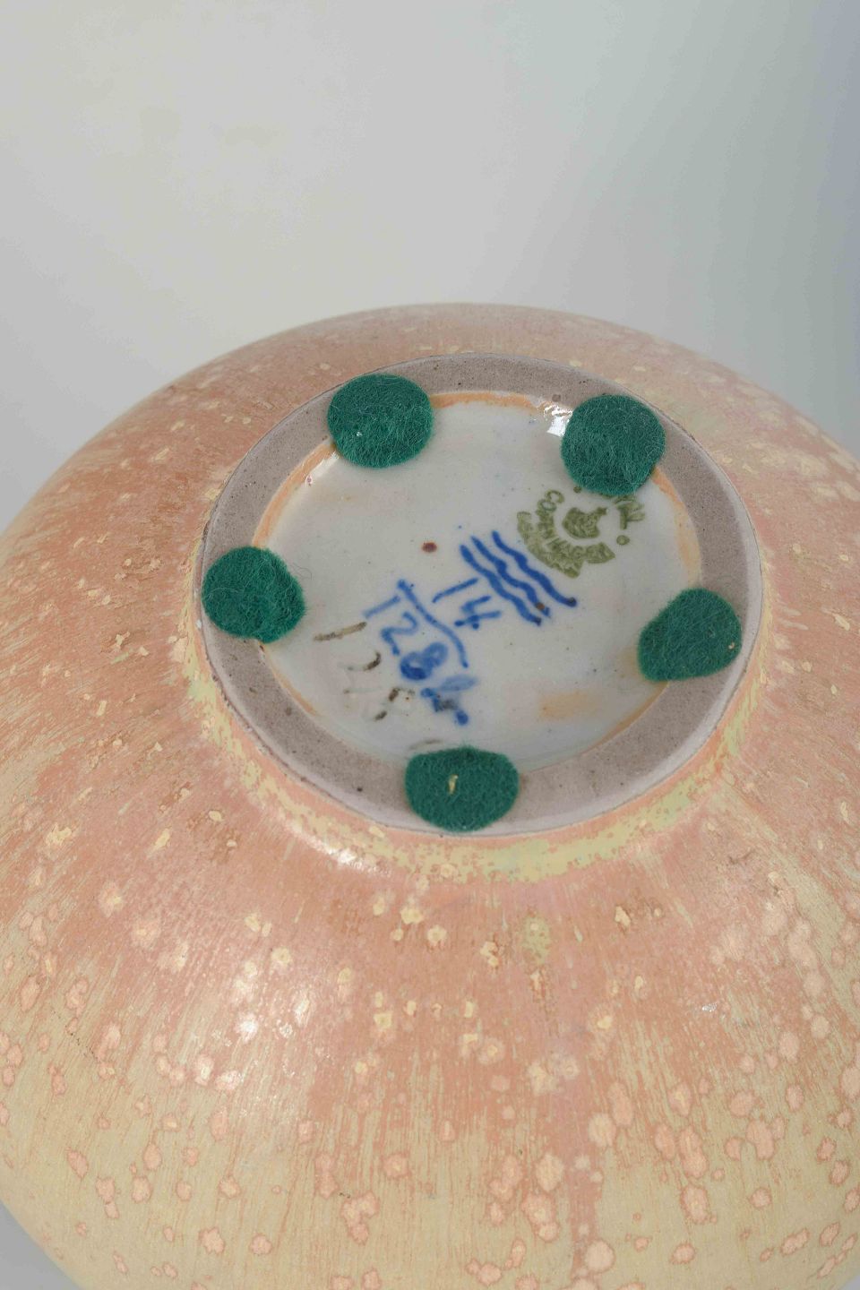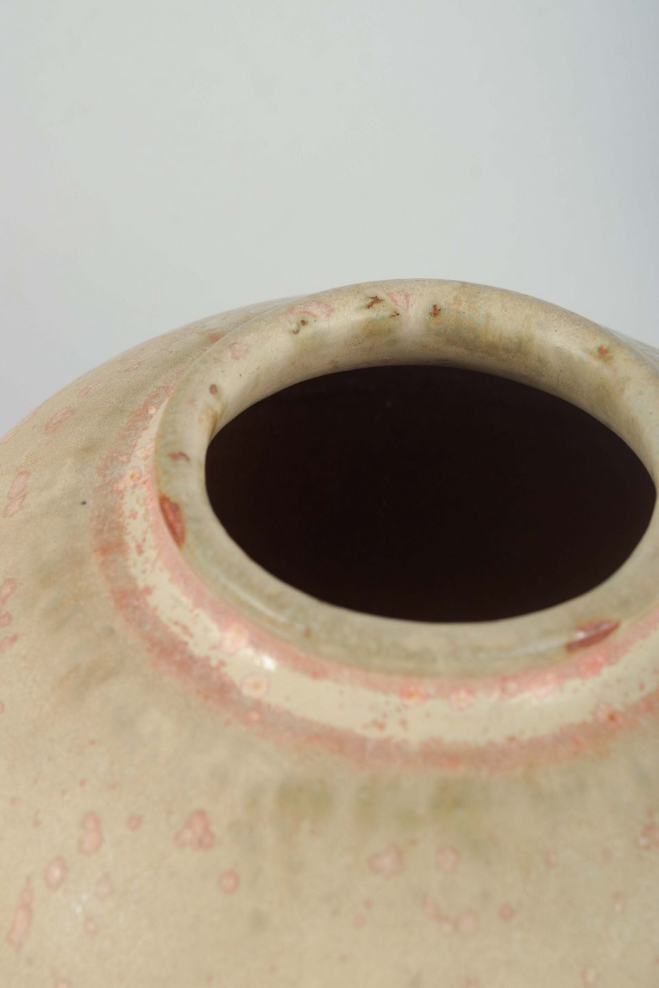 Organisk formet kuglevase i drejet stentøj med rå overflade og flerfarvet glasur i rosa, hvide og beige toner.