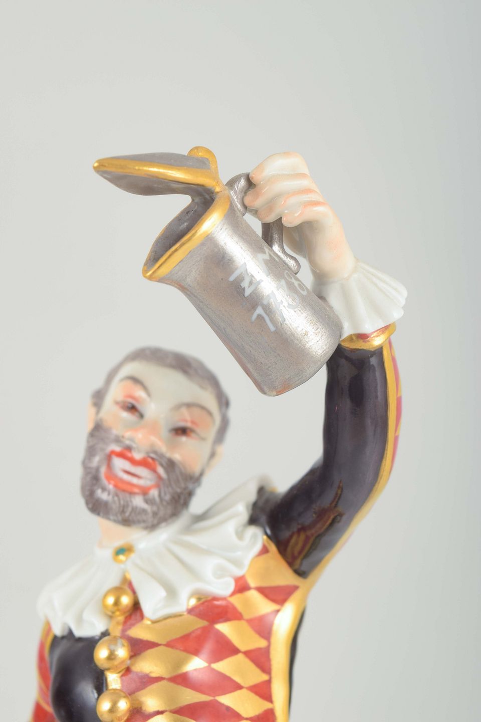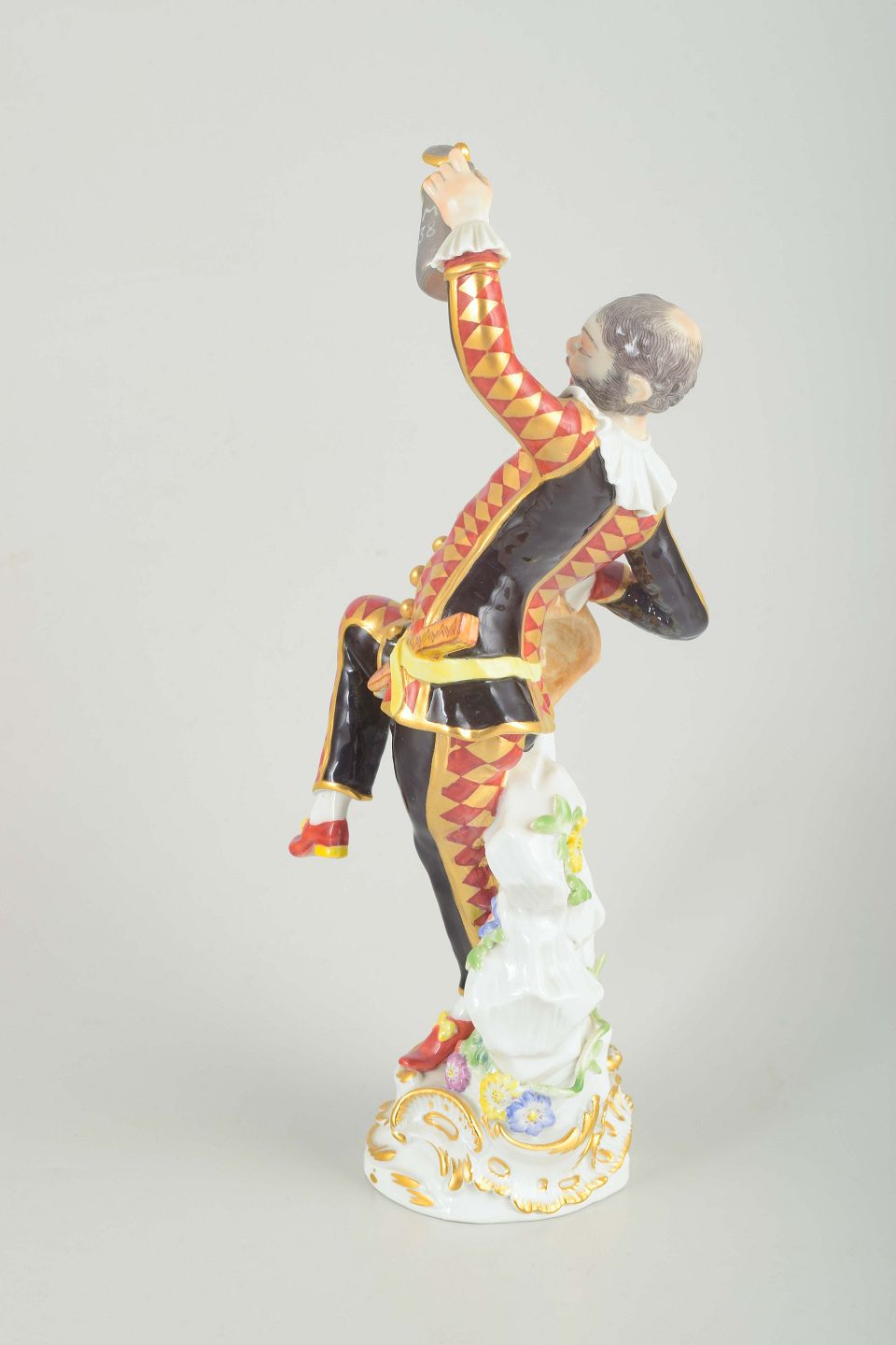 Pragtfuld og detaljerig porcelænsfigur af Harlekin i klassisk Commedia dell’arte-dragt, udført i de fineste farver med overdådig håndmalet staffering i rødt, guld og sort. Figuren skildrer Harlekin i festlig positur med løftet krus, rigt dekoreret med gulddetaljer og stående på en rokoko-inspireret base med blomster.