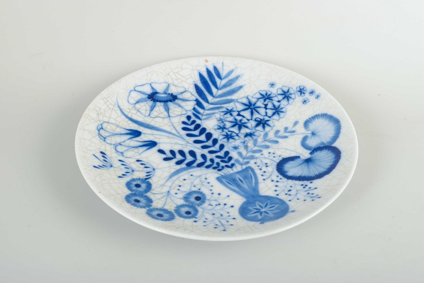 Round plate in porcelain/faience with hand-painted blue decoration in organic floral and leaf motifs. Underglaze with pronounced crackle. Marked “Arabia Unika – Made in Finland” on the reverse.