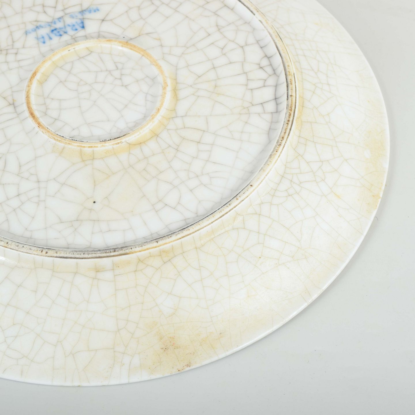 Rund tallerken i porcelæn/fajance med håndmalet blå dekoration i organisk blomster- og bladmotiv. Underglasur med tydeligt krakelé. Stemplet “Arabia Unika – Made in Finland” på bagsiden.
