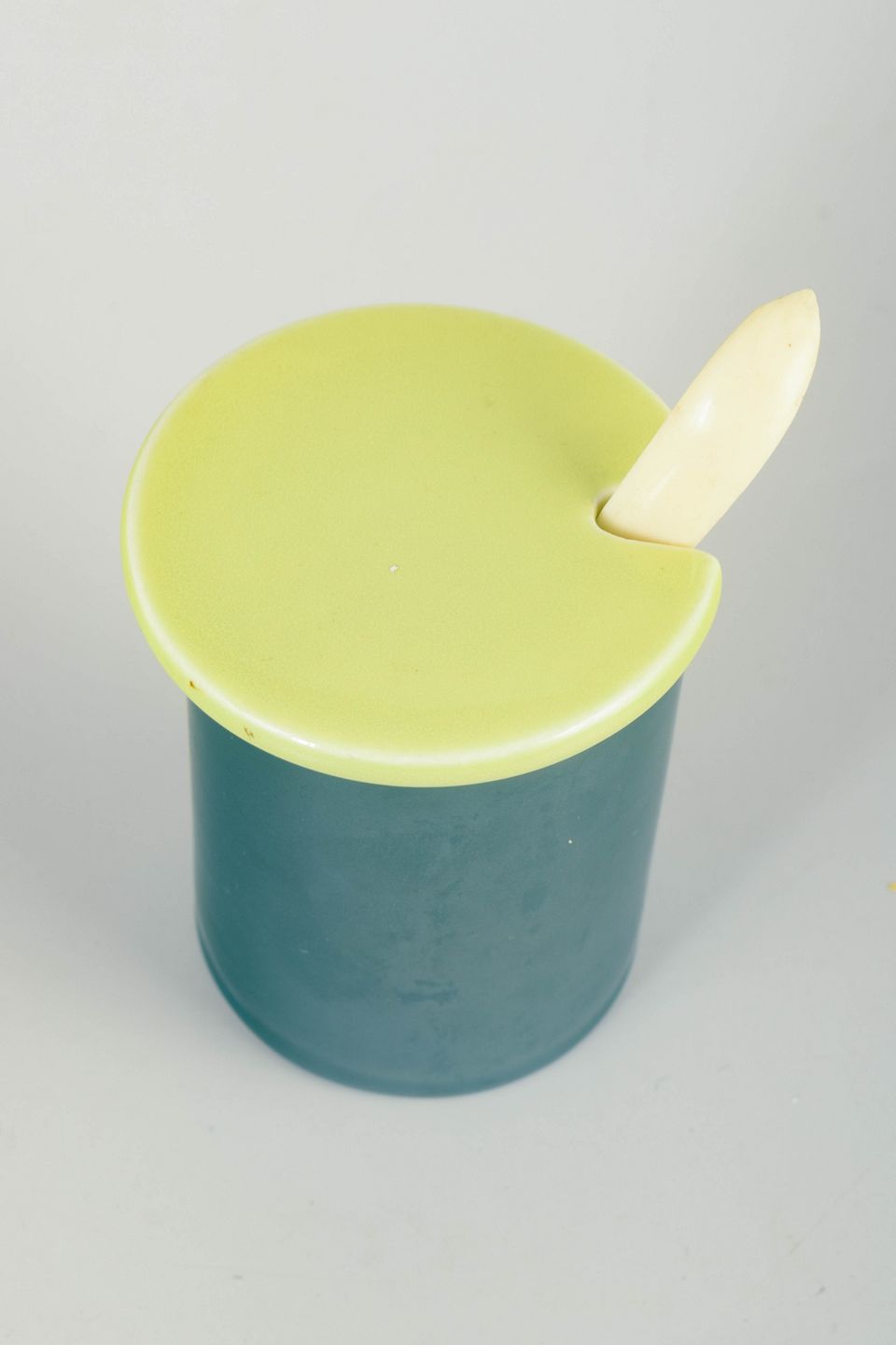Organisk formet lågkrukke i glaseret stentøj i mørkegrøn med lyst låg og ske.