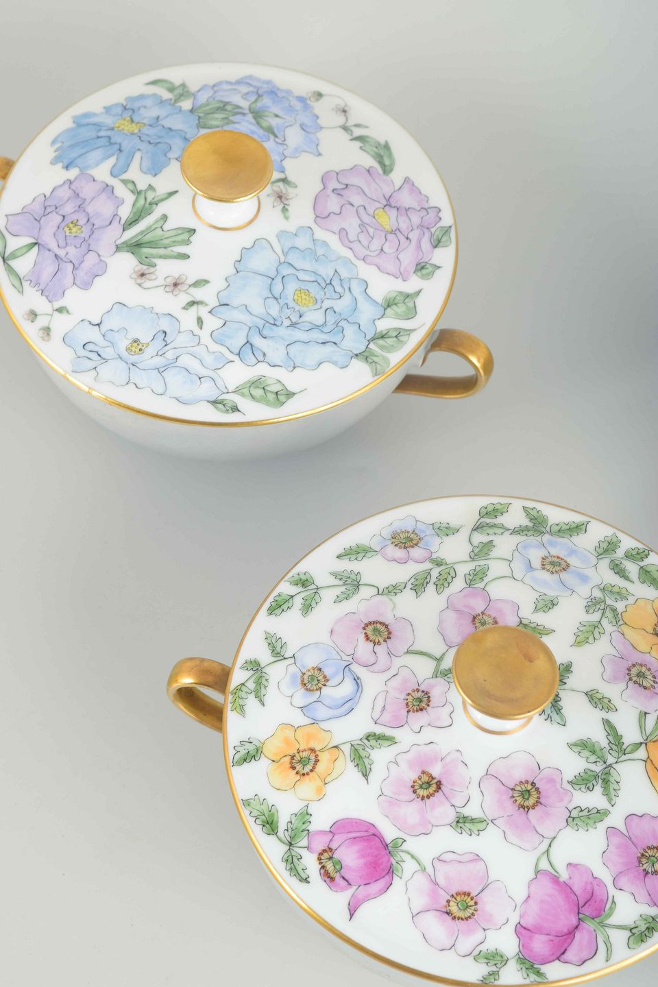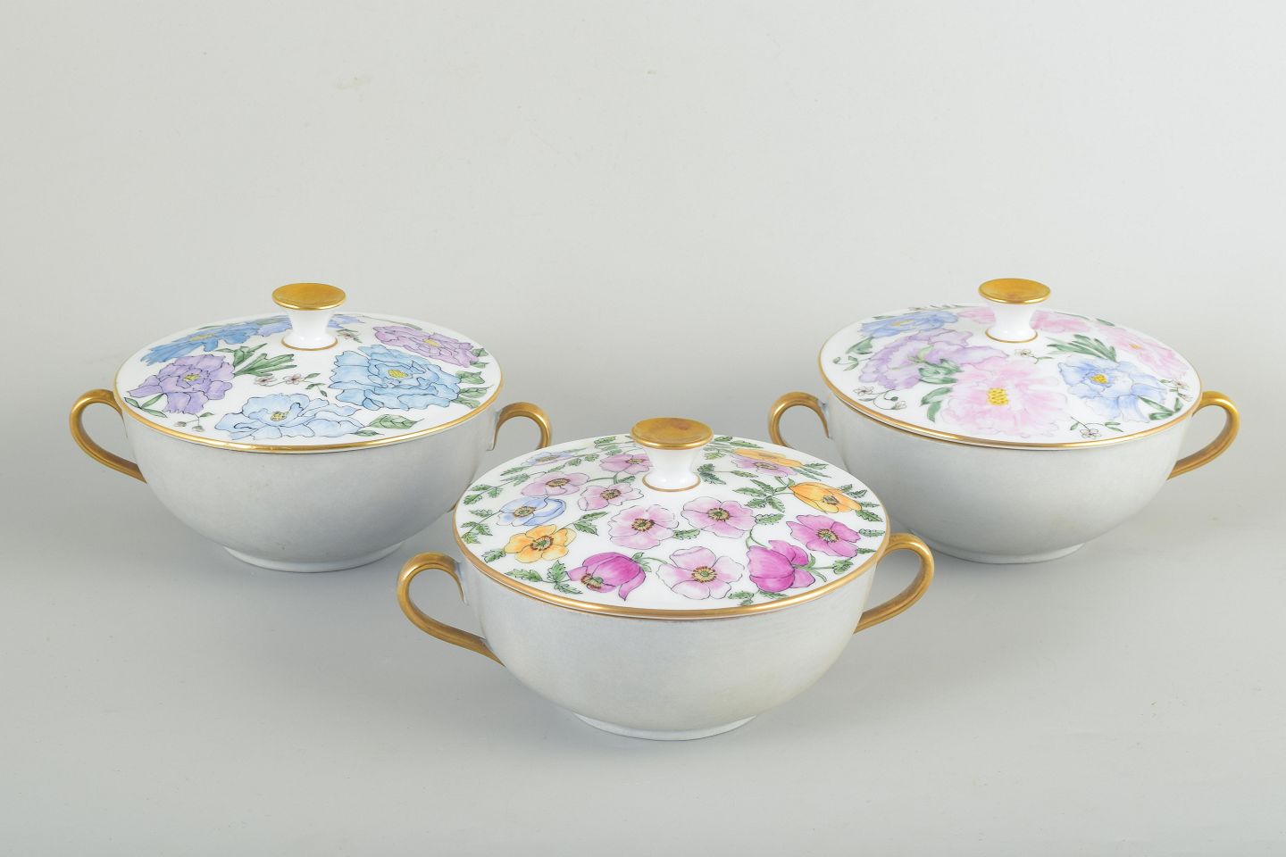 Sæt af 3 bouillonkopper i porcelæn med tilhørende låg, hånddekoreret med blomster i blå, lilla, rosa og grønne nuancer samt guldfarvede detaljer på hanke og knop.