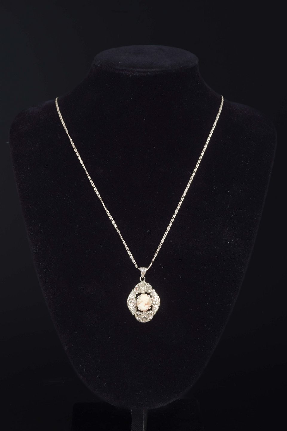 Sølvhalskæde med vedhæng, smukt udført med en klassisk cameo og blomsterornamentik.