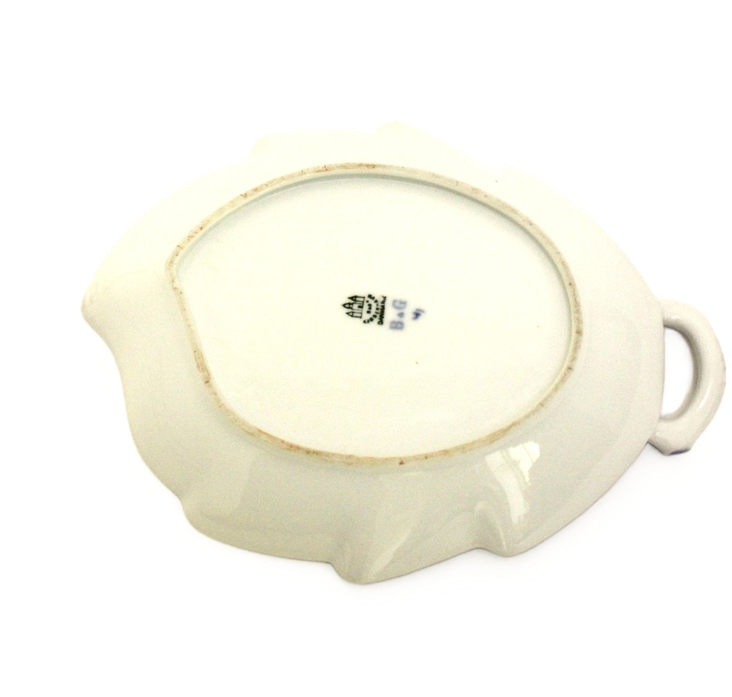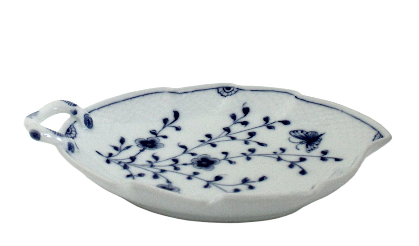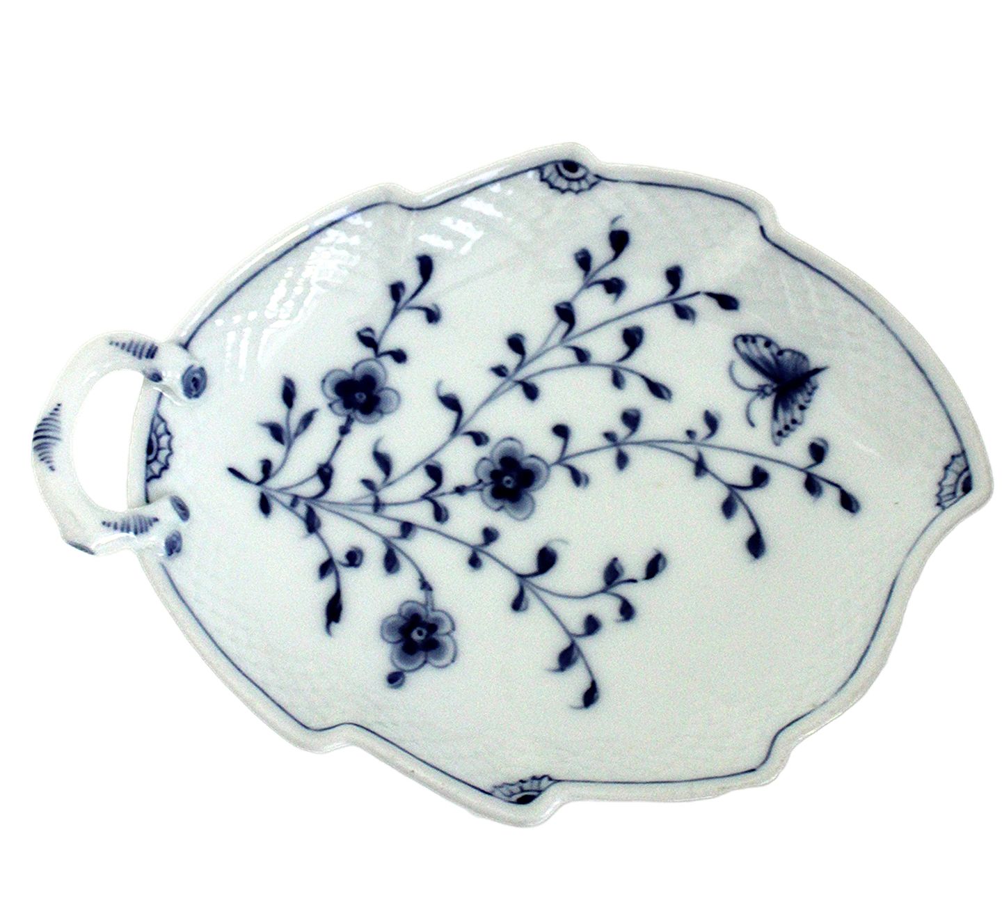 Text zugänglich auf Dänische: ing & Grøndahl, Sommerfugl. Bladassiet, småkagefad med hank. Længde 24,5 cm. Højde 3,5 cm. Produceret i perioden 1915-1948. III. sortering. Flot stand med bobler i glasuren som er typisk for den tid. Pris: 375 kr. stk. Lager: 1