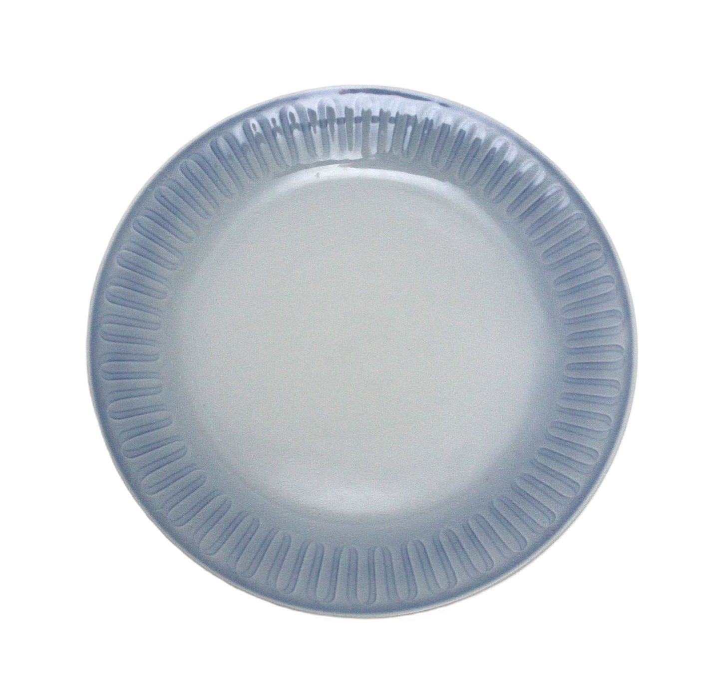 Text zugänglich auf Dänische: Bing & Grøndahl, Ballerina, lyseblåt porcelæn med stribet reliefmønster på fane. Stor Middagstallerken. Nr. 624. Diameter 26 cm. Fin stand med almindelig brugsspor på overfladen. Pris: 150 kr. stk. Lager: 5