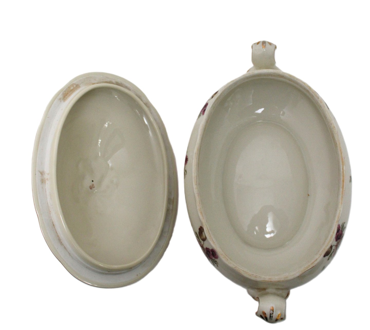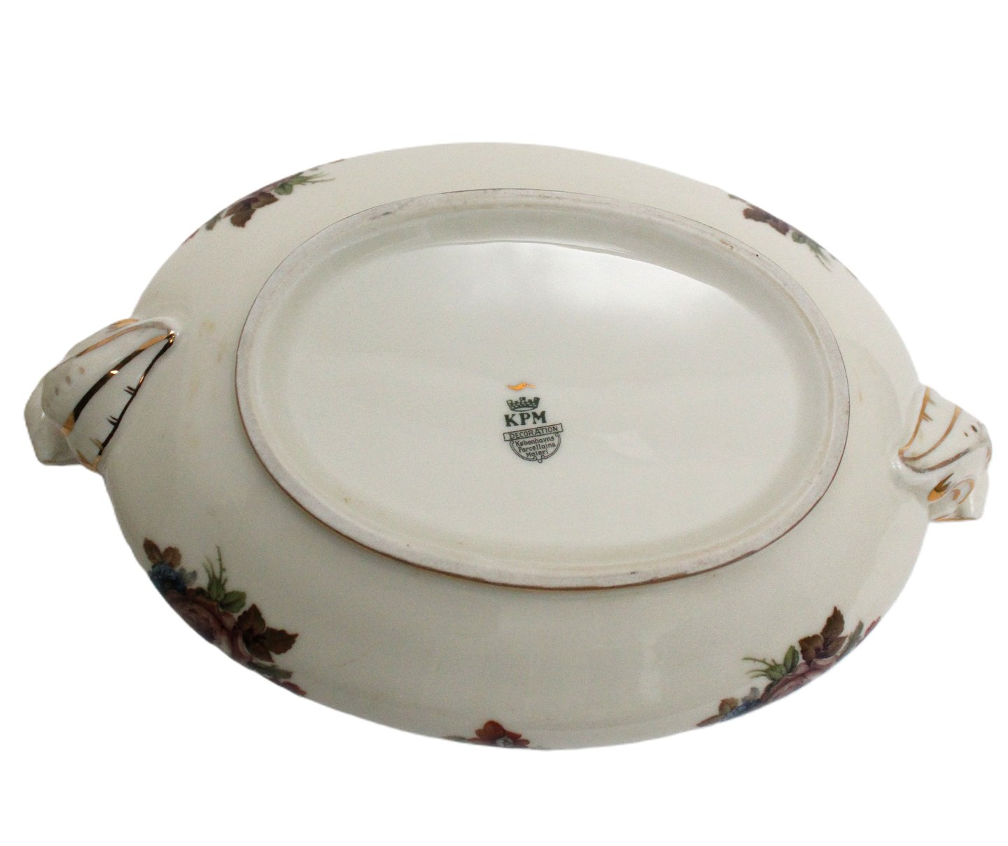 Text available in Danish: Kjøbenhavns Porcellains Maleri, Rosenborg, Terrin med låg og ører. Længde 33 cm. Bredde 19 cm. Højde 18 cm. Fin stand med lidt guldslitage på ører. Pris: 450 kr. stk. Lager: 1