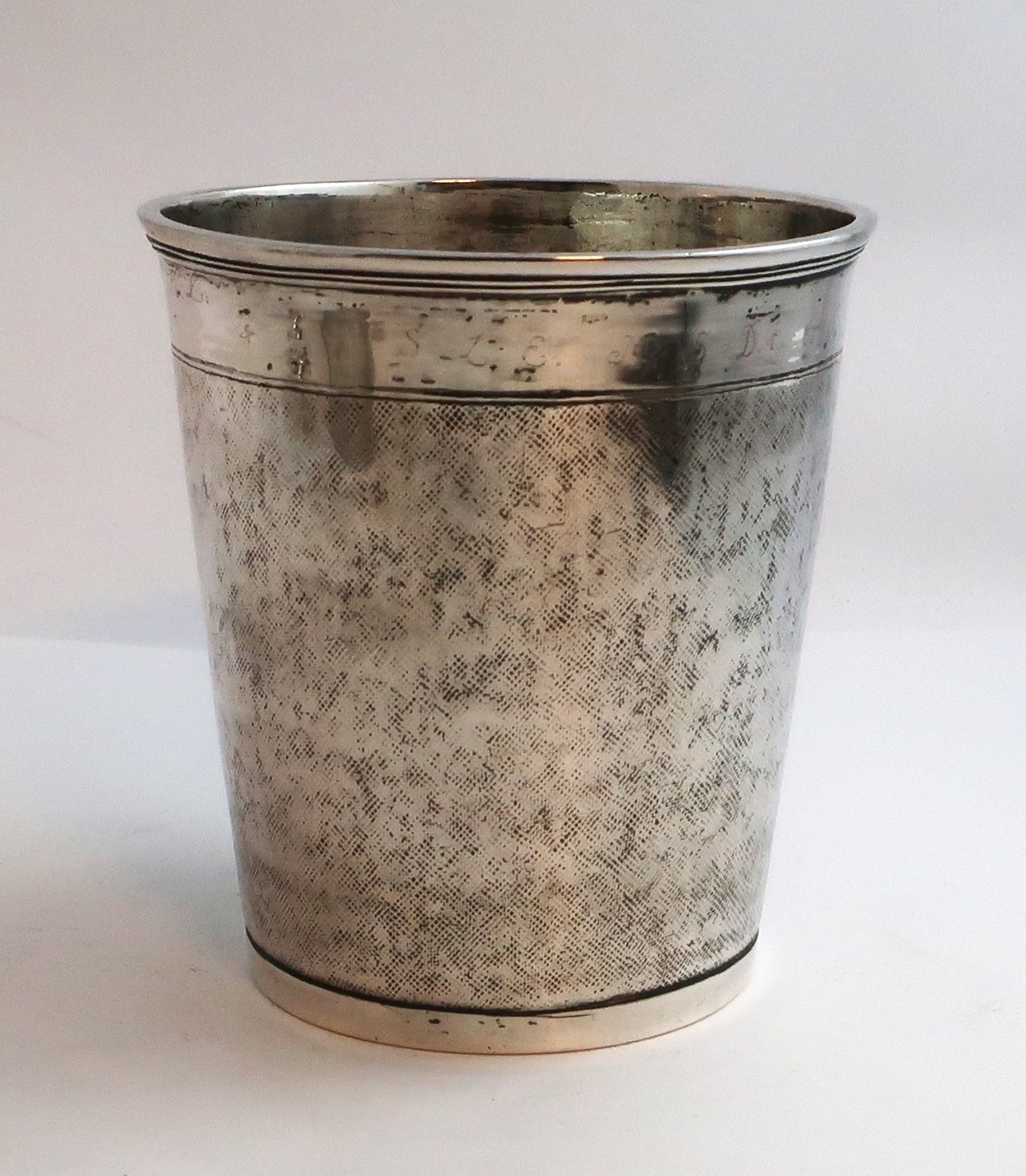 Großer Silberpokal. Silbermeister unbekannt. Gravur von 1756. Höhe 11 cm. Durchmesser 10 cm.