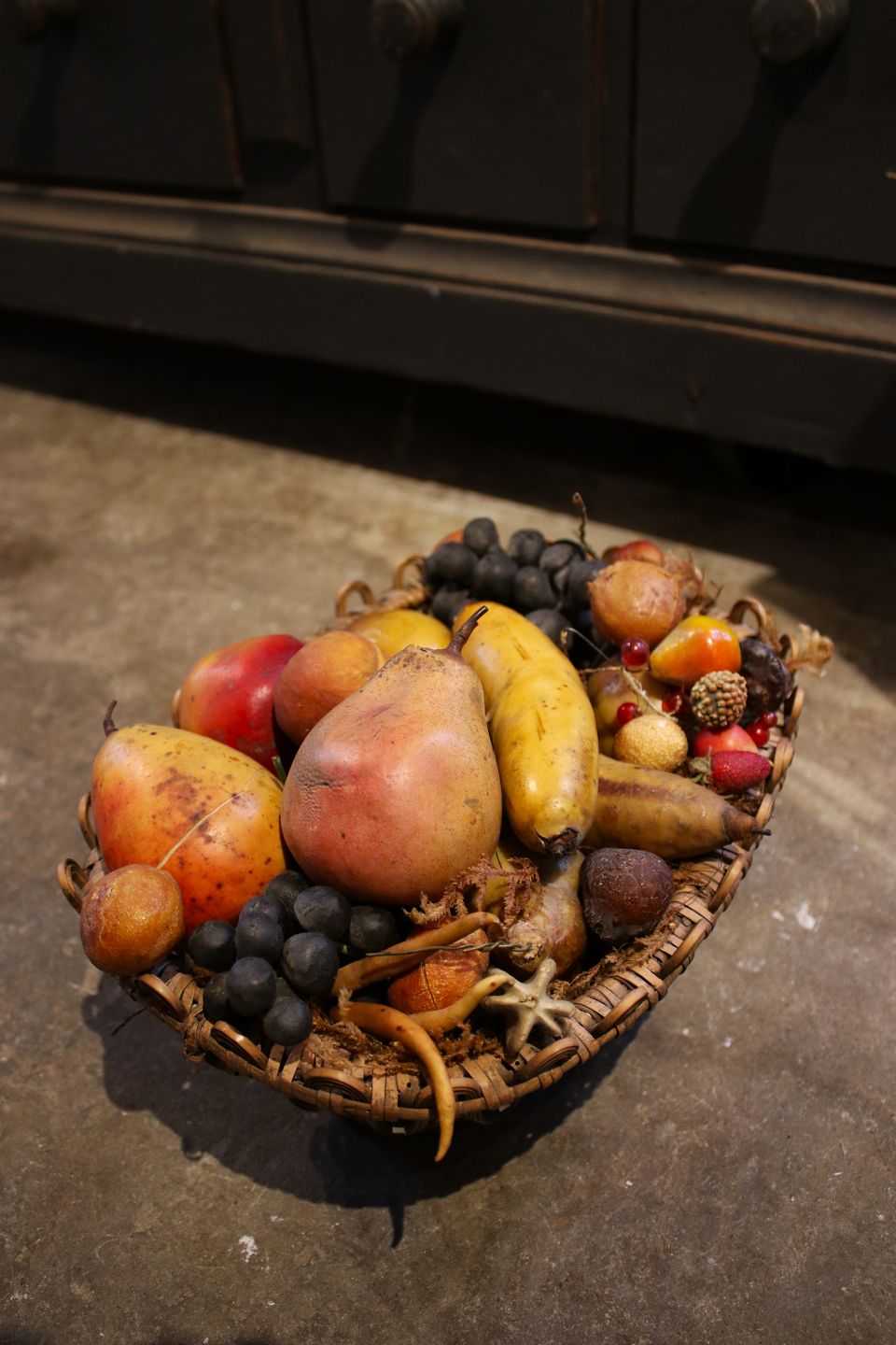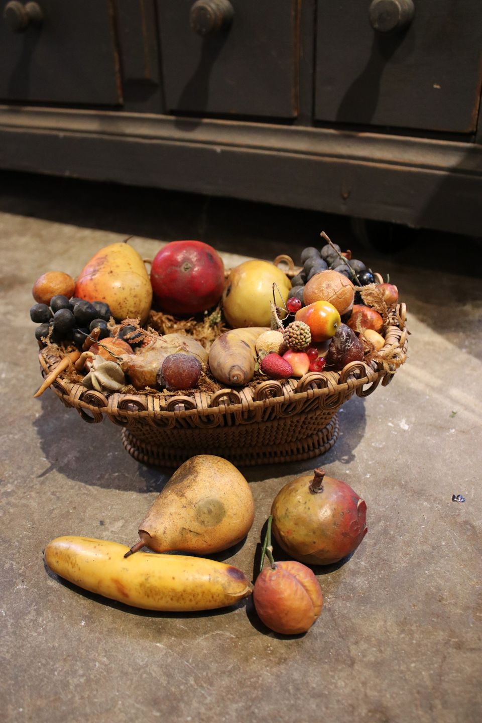 Dekorativ fransk frugtkurv fra 1800 tallet bestående af flettet kurv fyldt med frugter i vat og bemalet voks...