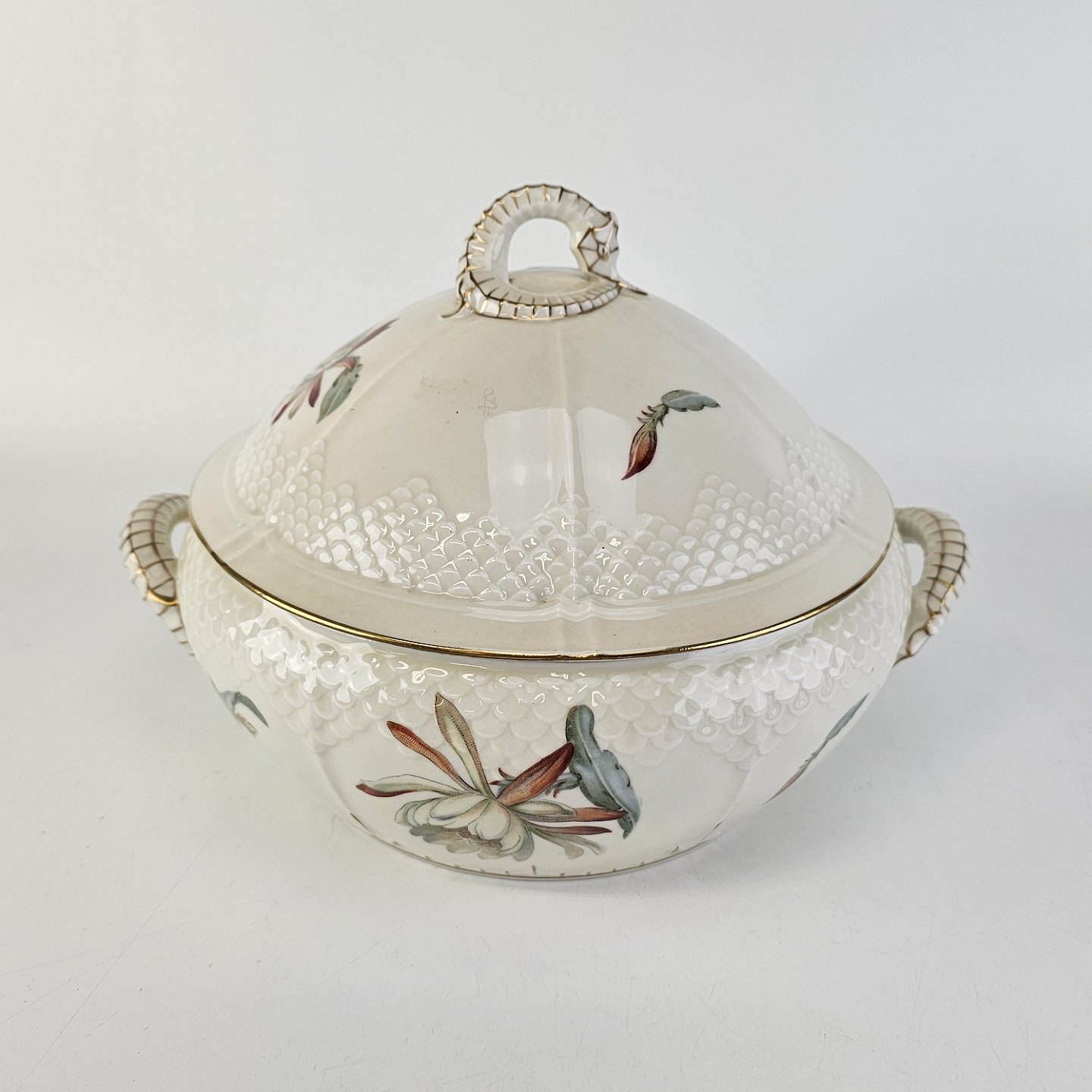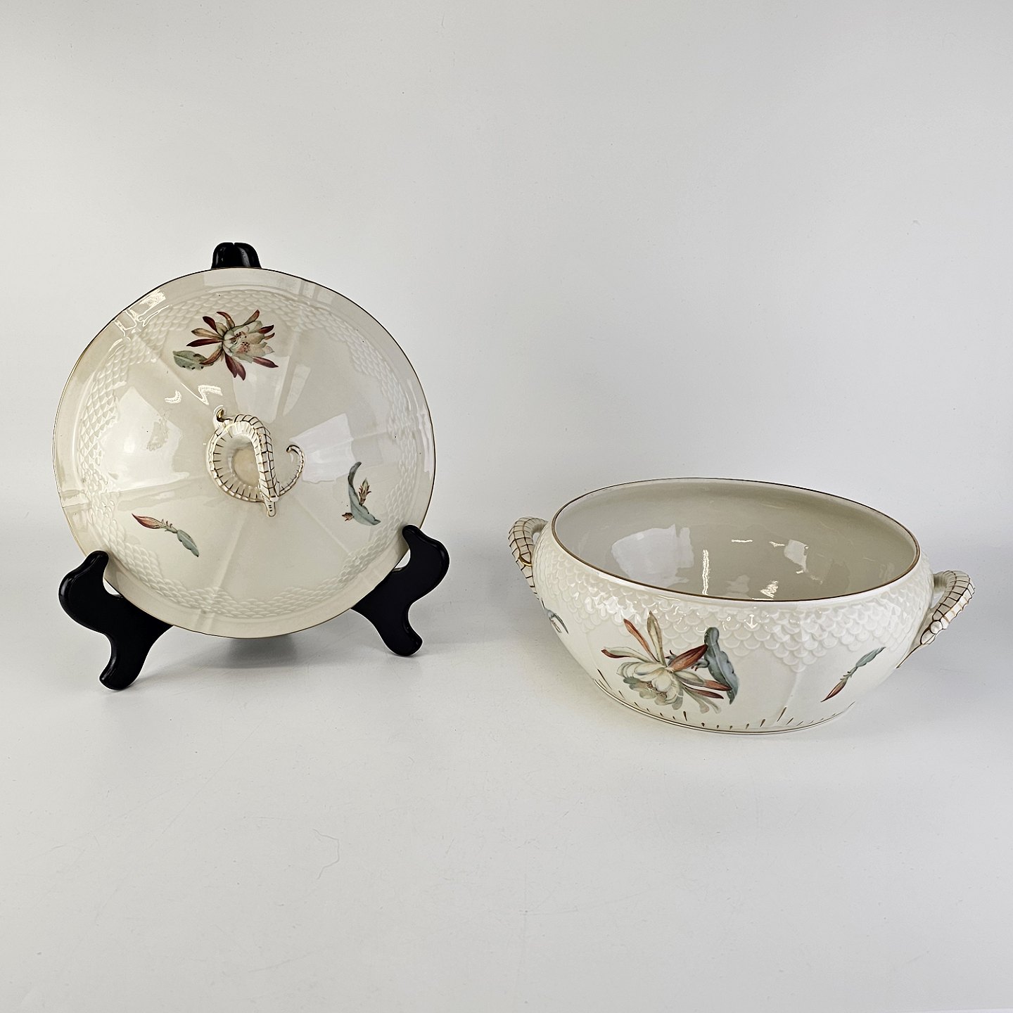 Kaktus er cremefarvet porcelæn i skælform, dekoreret med kaktusblomster og guldkant