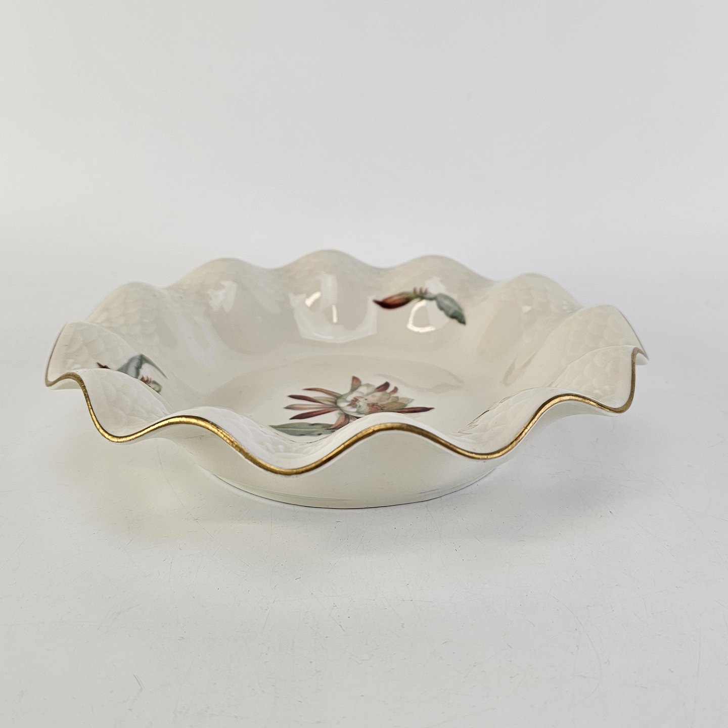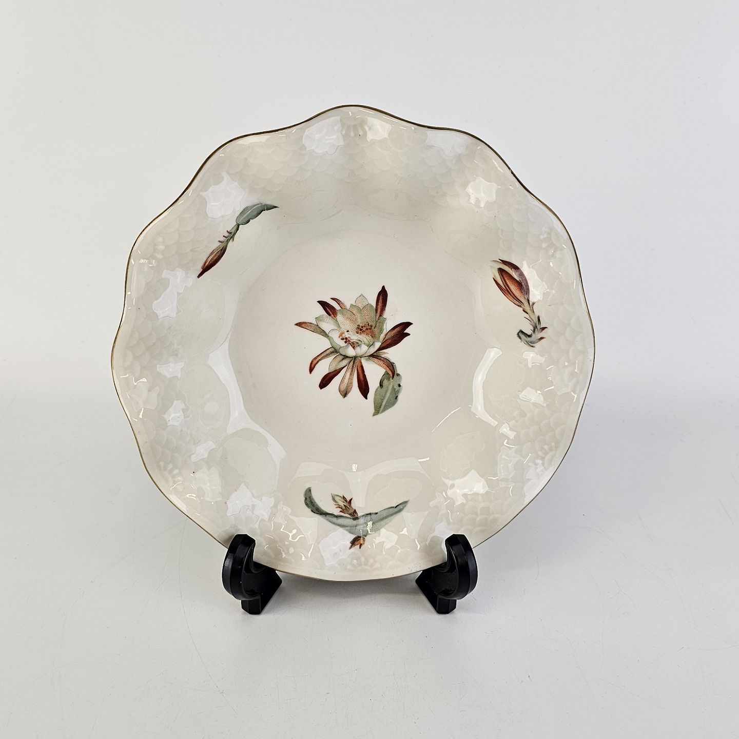 Kaktus er cremefarvet porcelæn i skælform, dekoreret med kaktusblomster og guldkant