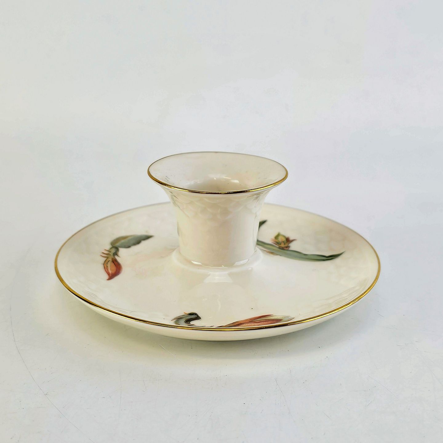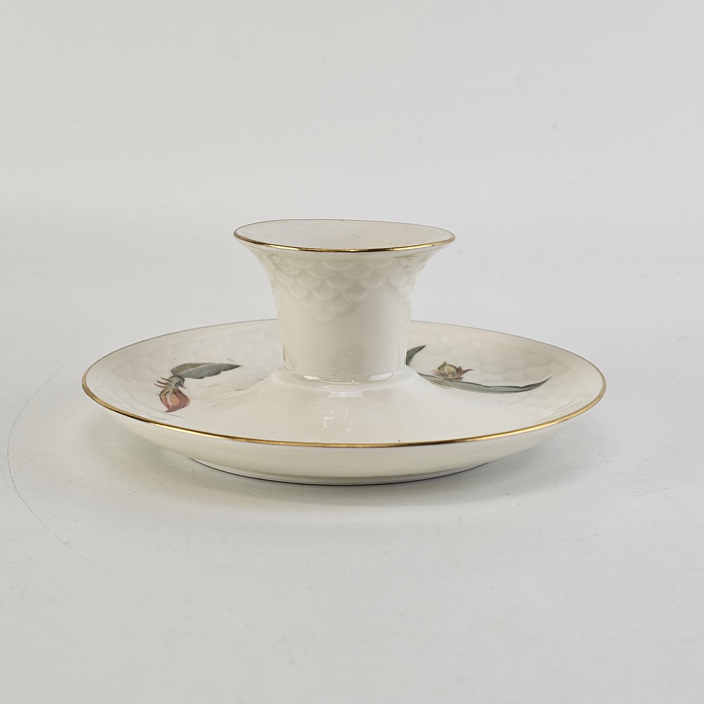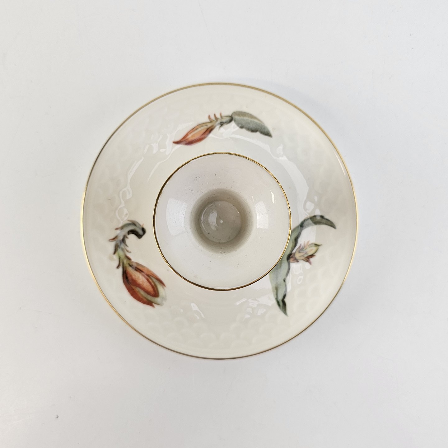 Kaktus er cremefarvet porcelæn i skælform, dekoreret med kaktusblomster og guldkant