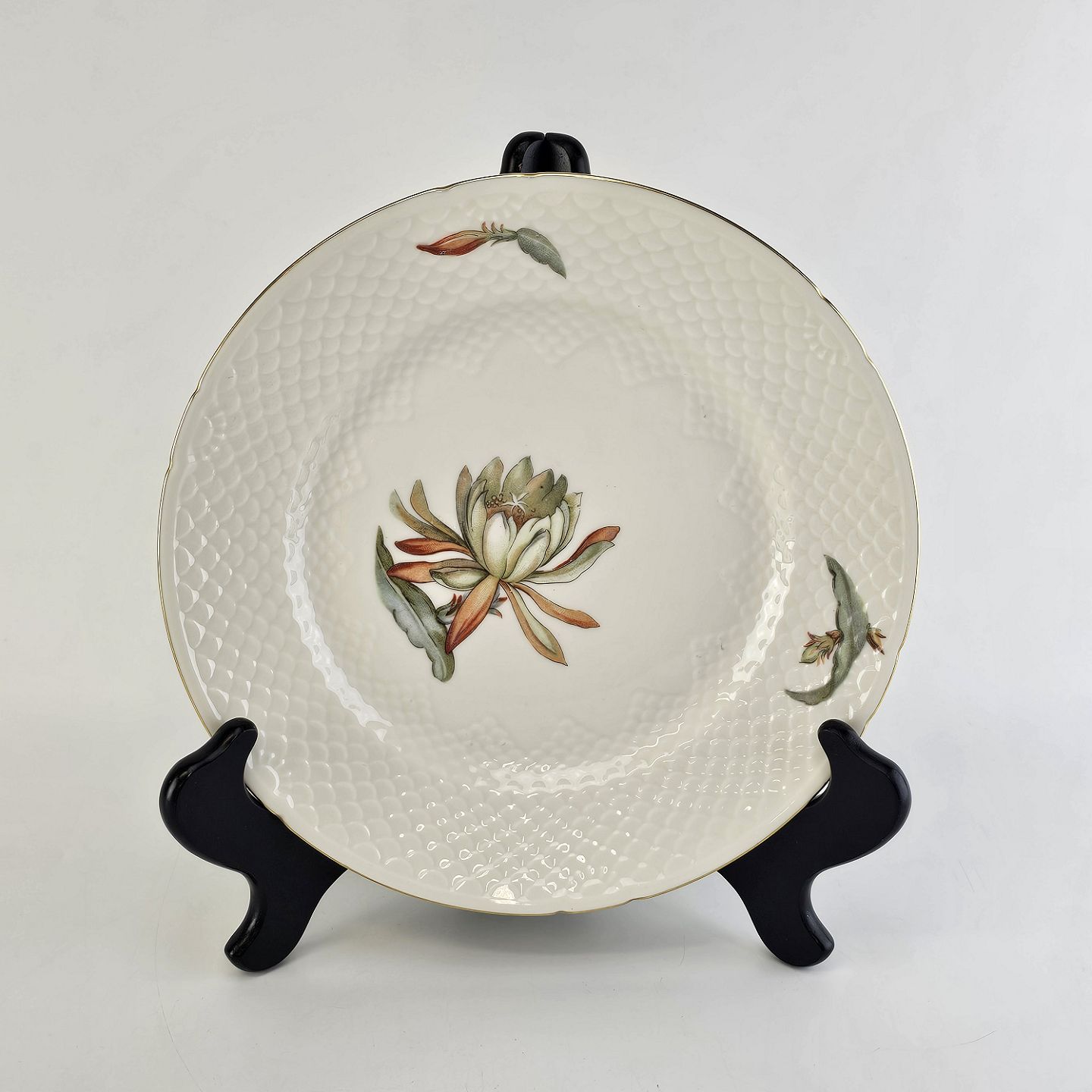 Kaktus er cremefarvet porcelæn i skælform, dekoreret med kaktusblomster og guldkant