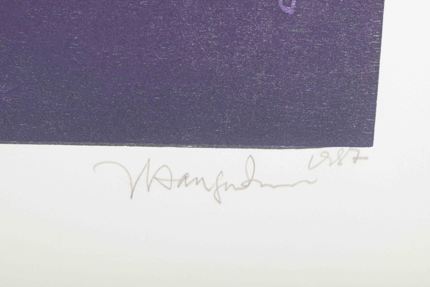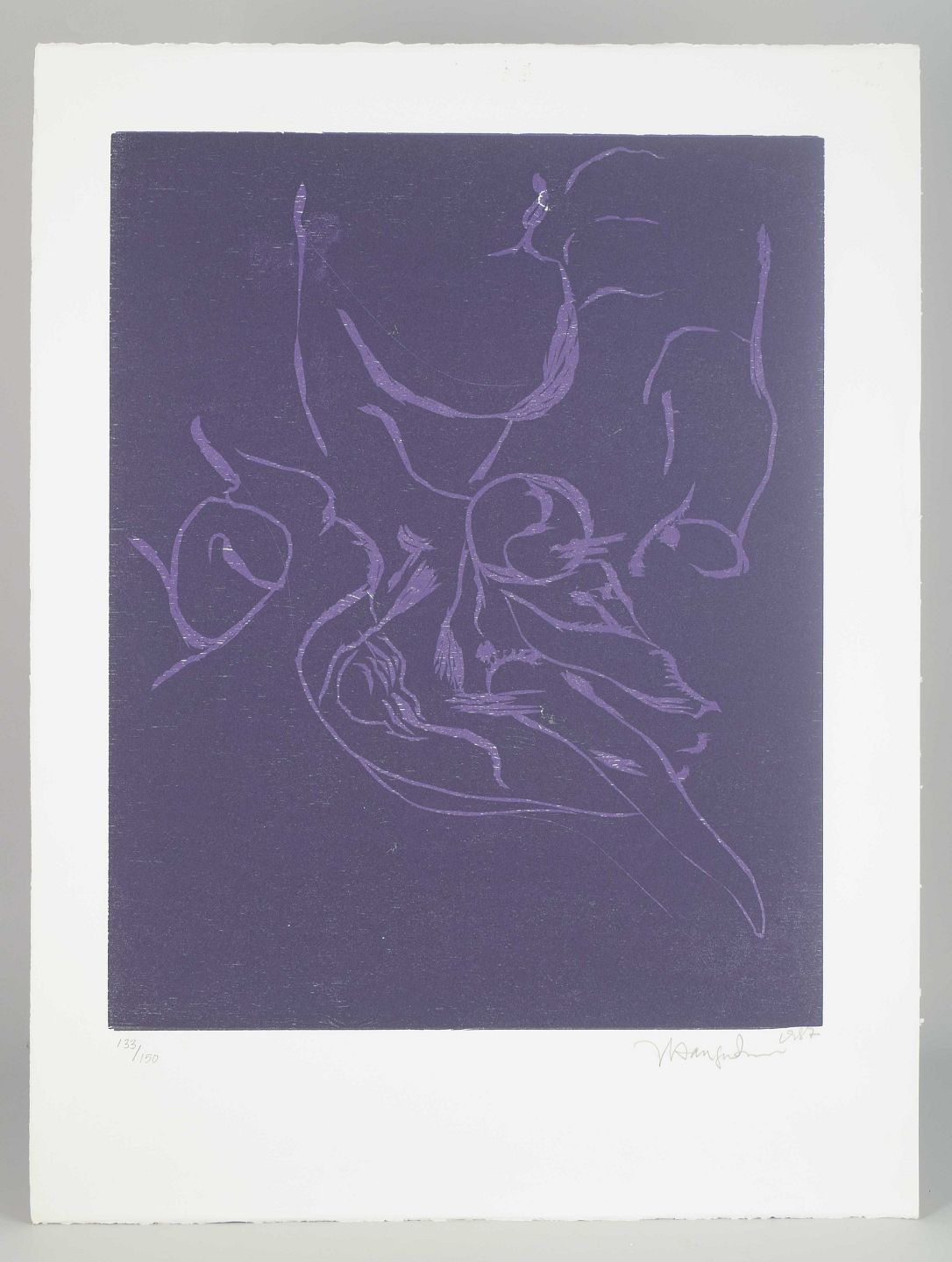 Abstrakt komposition i violette toner, hvor enkle linjer og organiske former danner et næsten kalligrafisk billedsprog. Et karakteristisk grafisk blad af billedhuggeren, der gennem hele sit virke arbejdede med ekspressive udtryk på tværs af materialer.