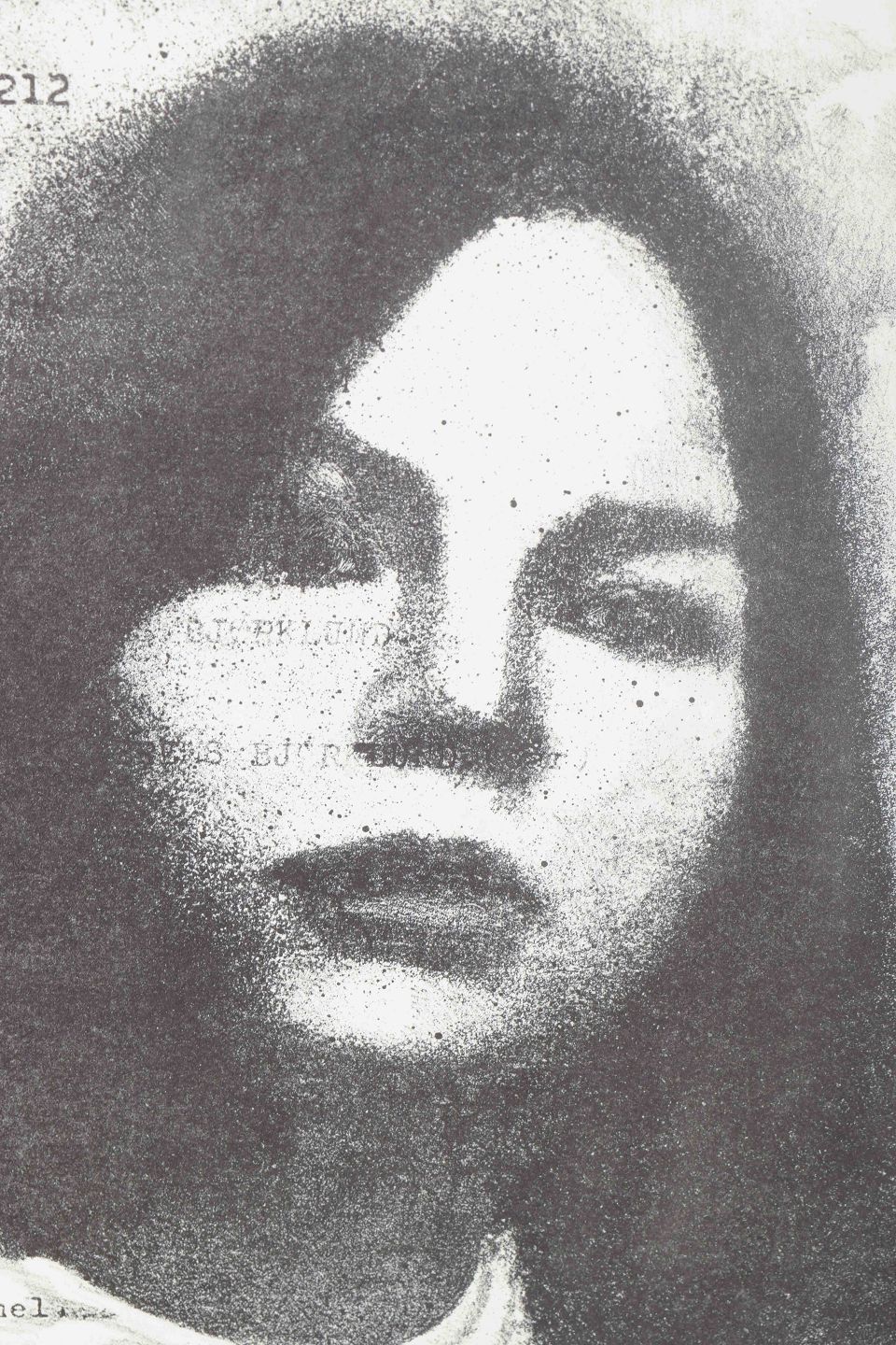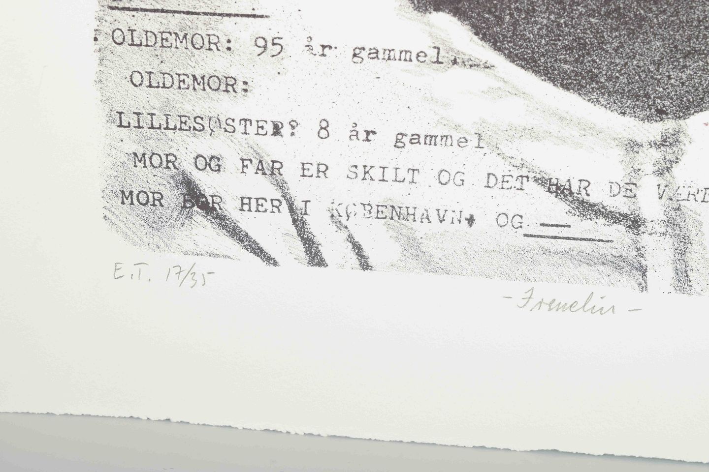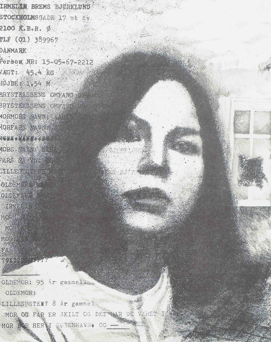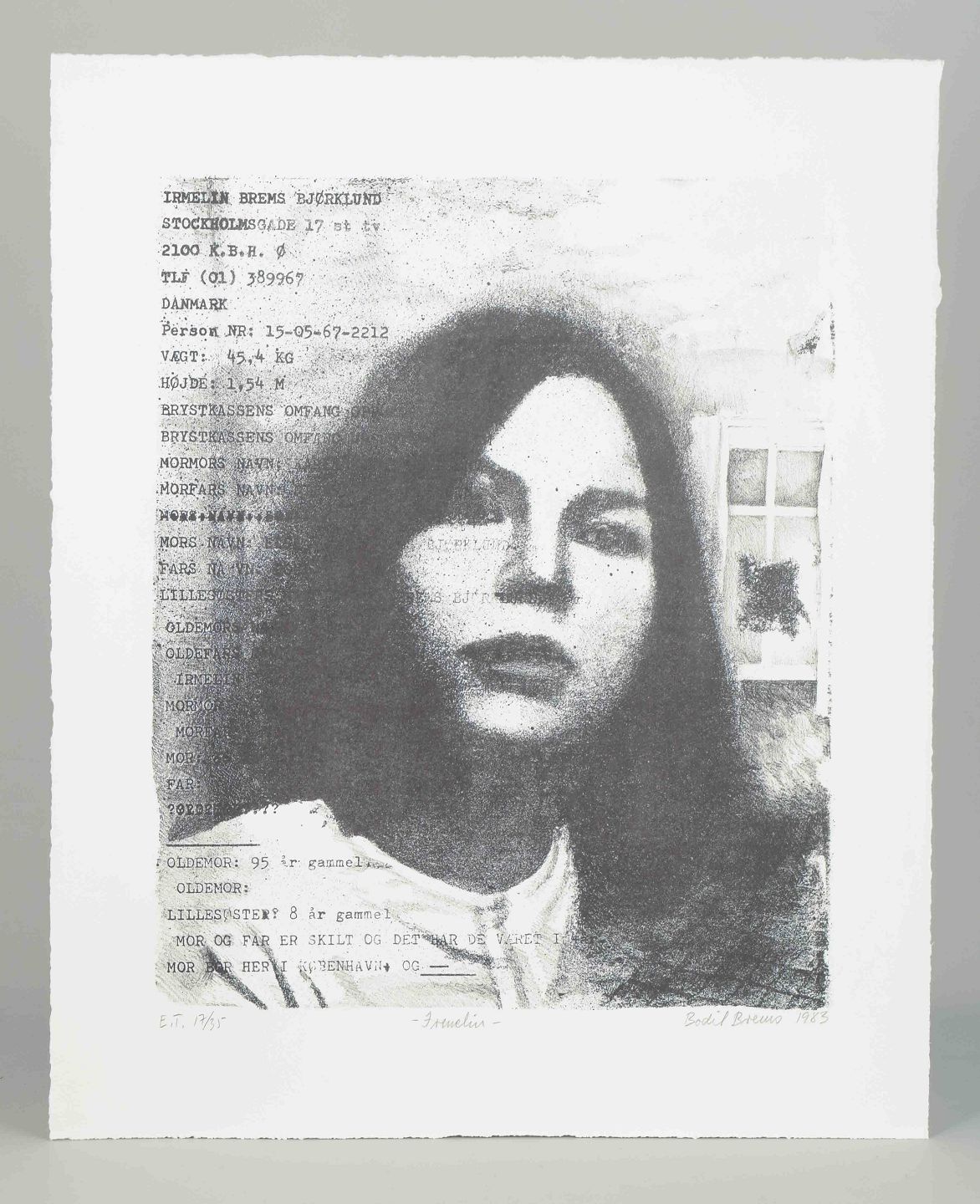 Et grafisk portræt, hvor et kvindeligt ansigt fremstår i kontrast til en baggrund af maskinskrevet tekst med personlige oplysninger. Værket leger med mødet mellem det officielle, registrerede og det intime, private. Teksten om familieforhold og alder kombineret med portrættet skaber et stærkt udtryk af identitet og social kontekst.