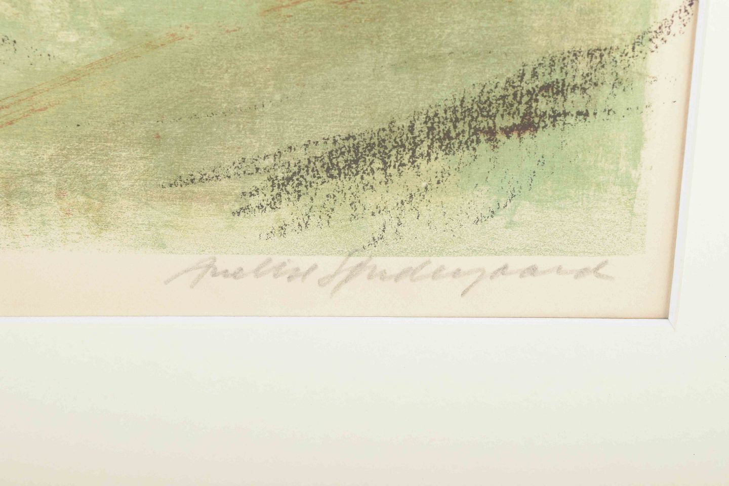 Et stemningsfuldt og poetisk litografi, der viser et hvidt hus placeret på en bakketop omgivet af træer og hegn. Værket er udført i Søndergaards karakteristiske enkle og stoflige formsprog, hvor bløde farvetoner og skitseagtige streger skaber en rolig og let drømmende atmosfære.