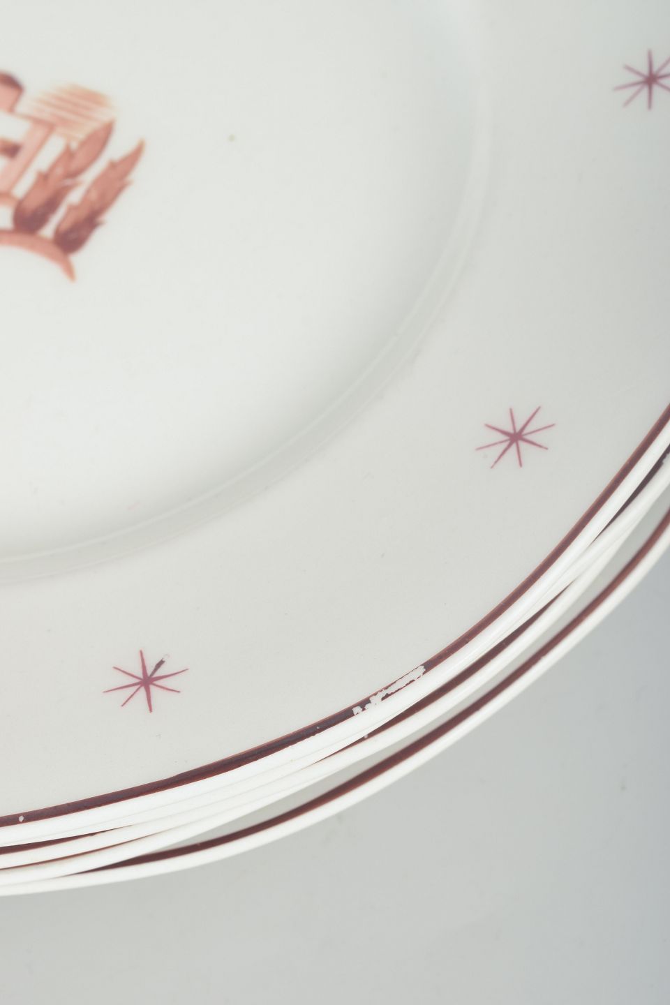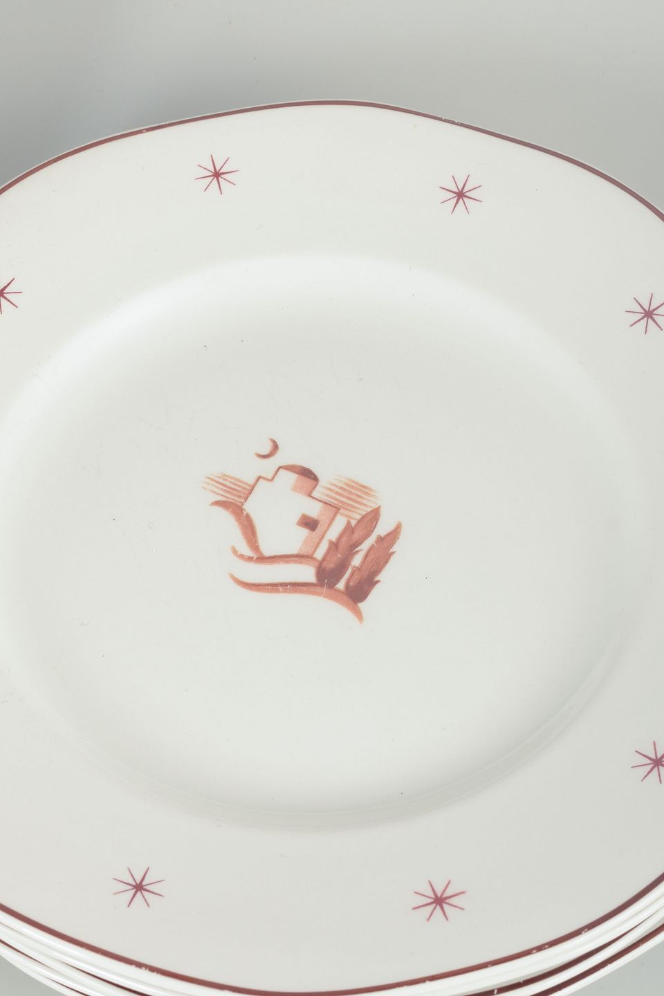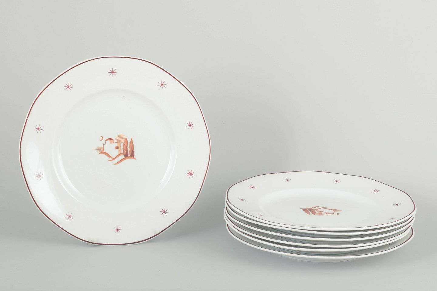 Art Deco-inspirerede tallerkener i hvidt porcelæn med dekoration i brune og gyldne toner, stjerneornamenter langs randen samt motiv af et hus og træer.