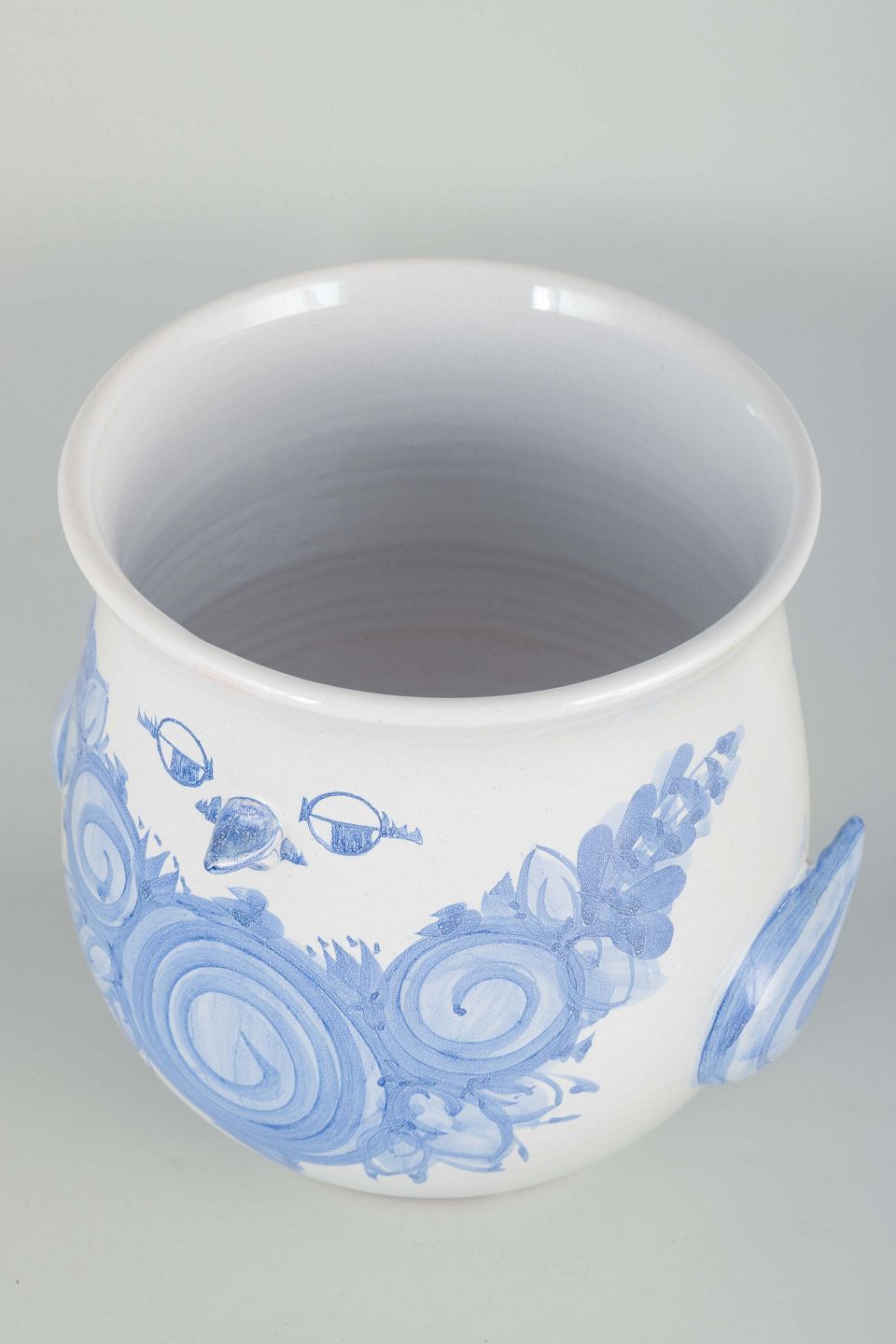Organisk formet urtepotte-skjuler i hvidglaseret fajance med håndmalet blå spiral- og blomstermotiv.