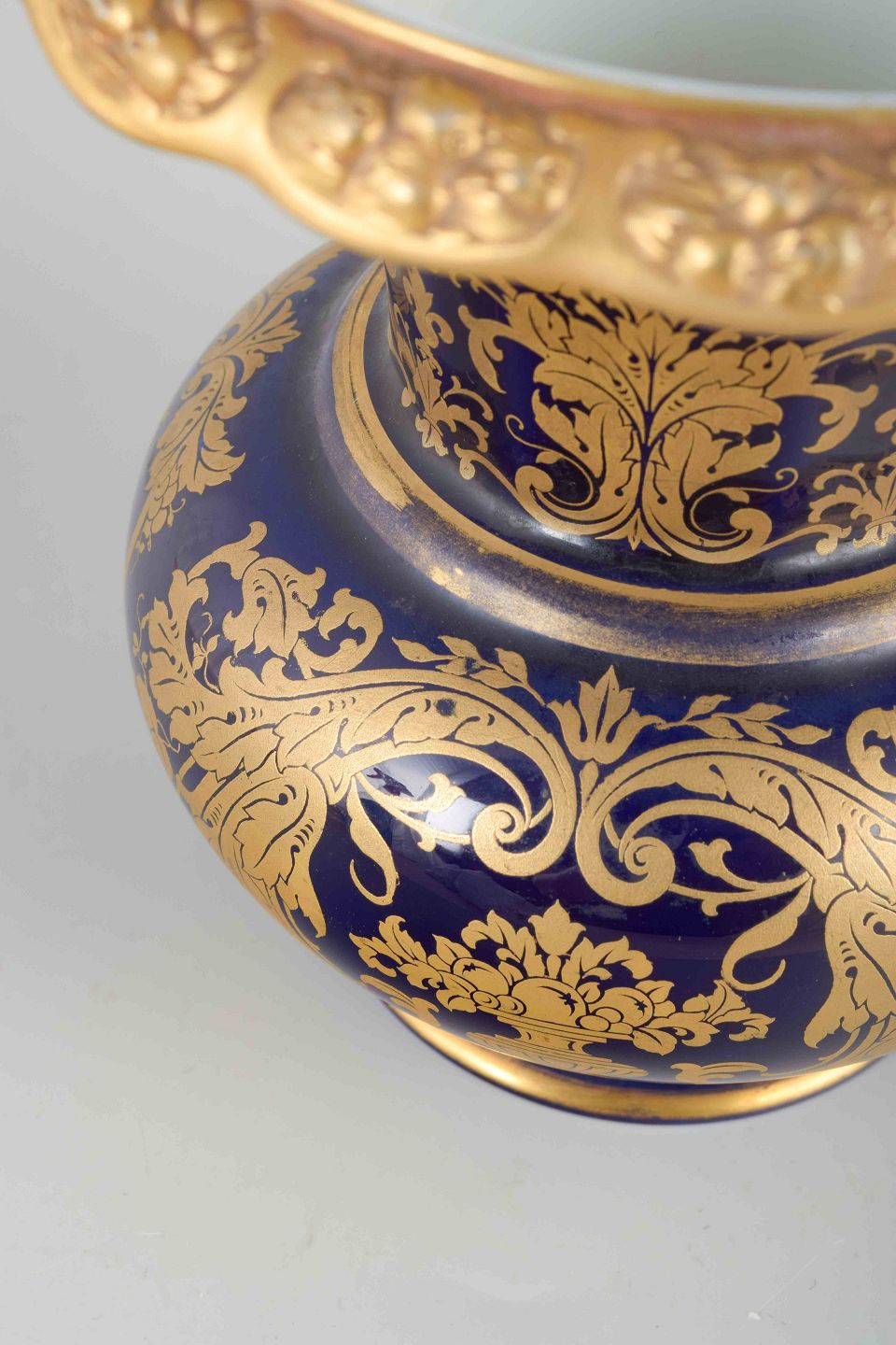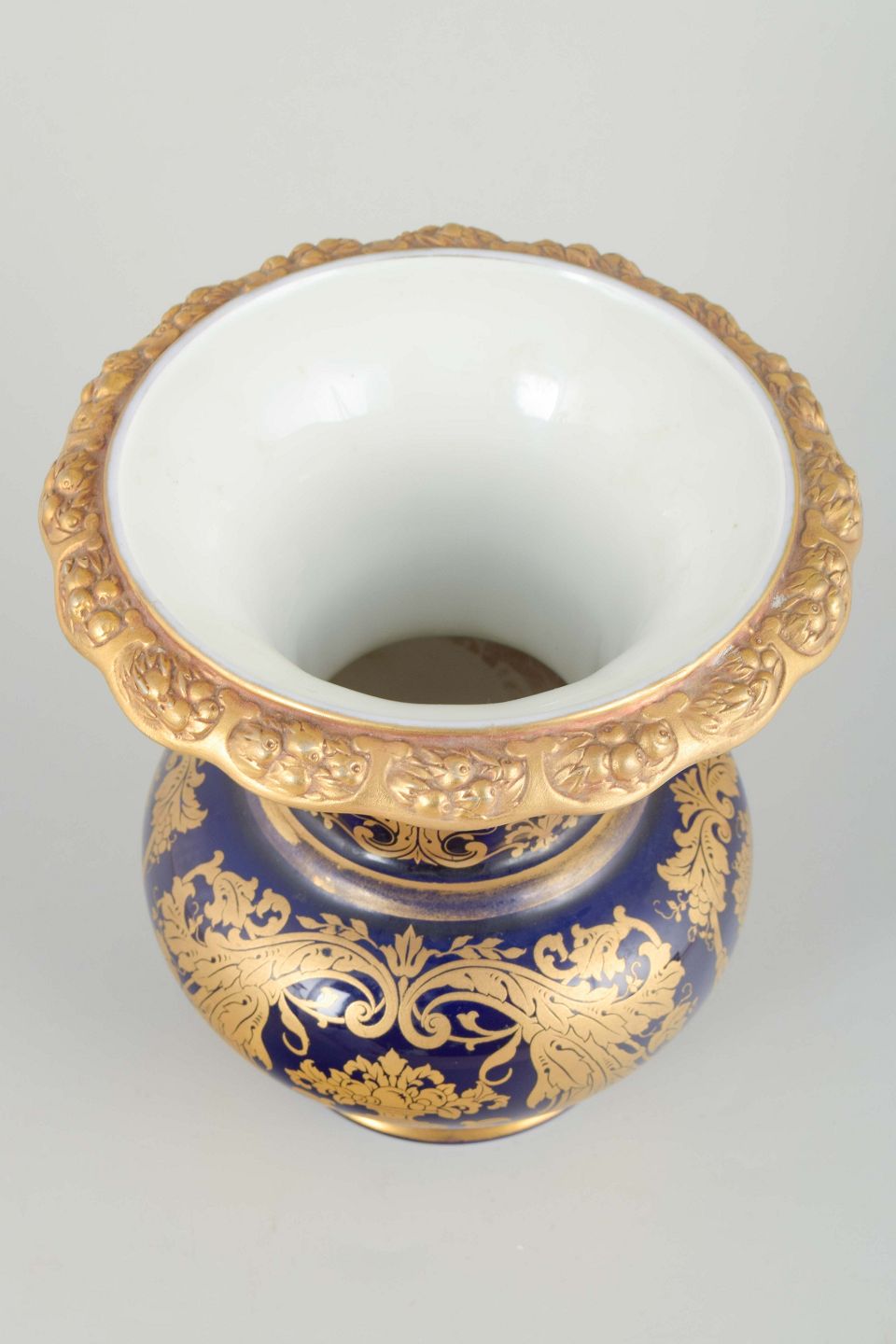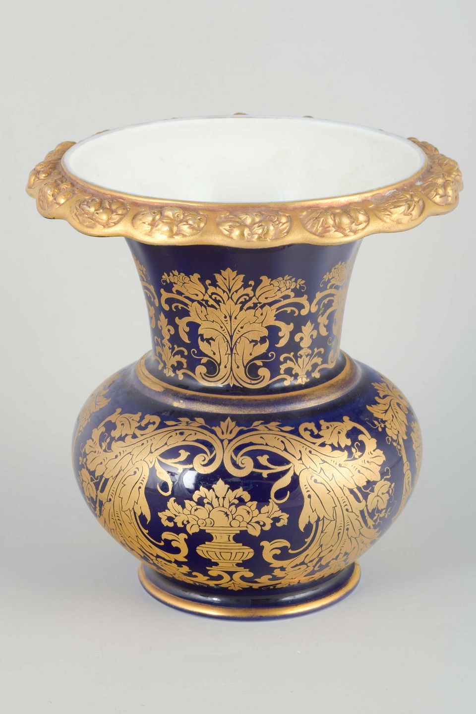 Dekorativ vase i porcelæn med rig koboltblå glasur og forgyldt blomstermotiv. Elegant udformet med bølget åbning i guld.