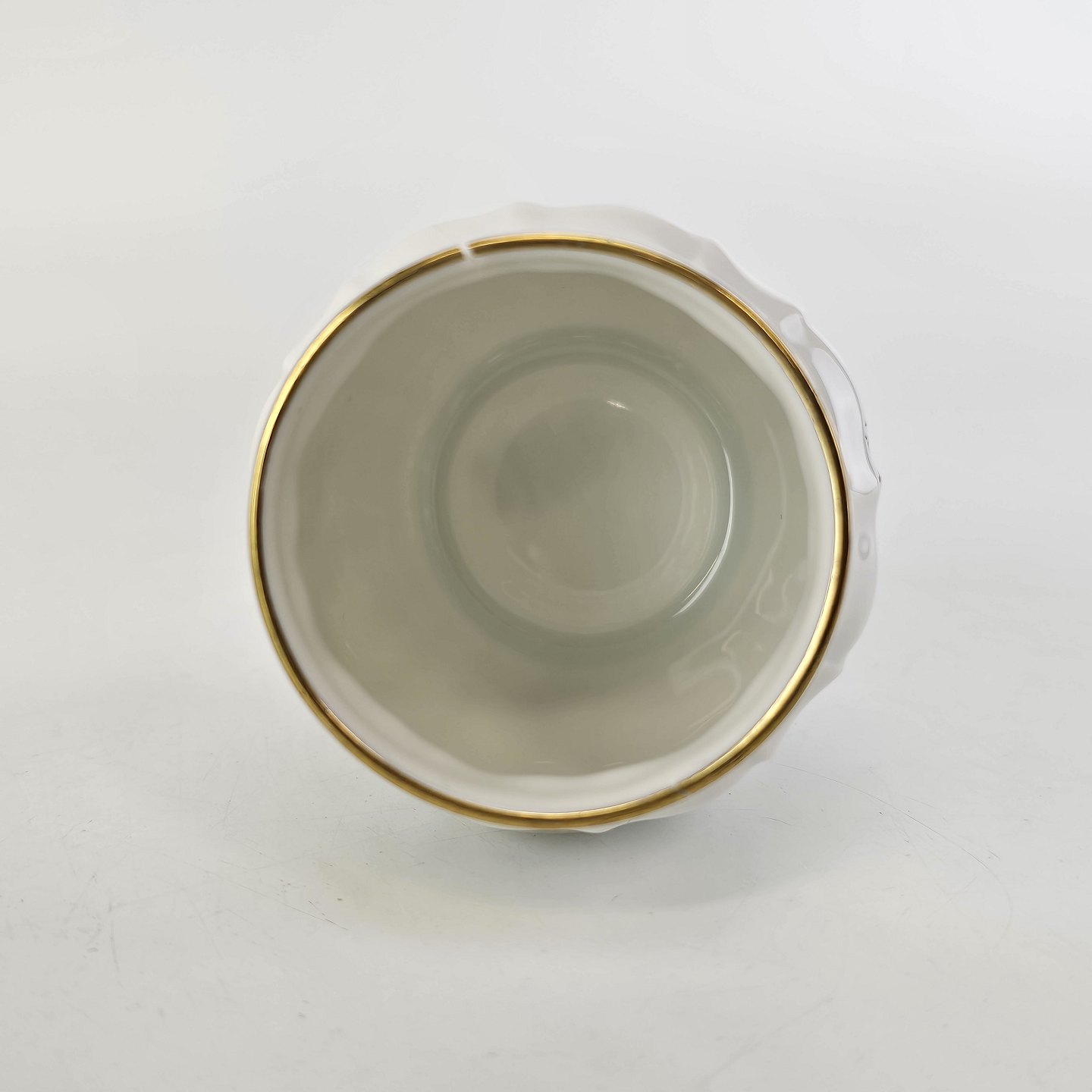 Service i glat hvidt porcelæn med lige knækkede kanter dekoreret med gule blomster og gylden kant