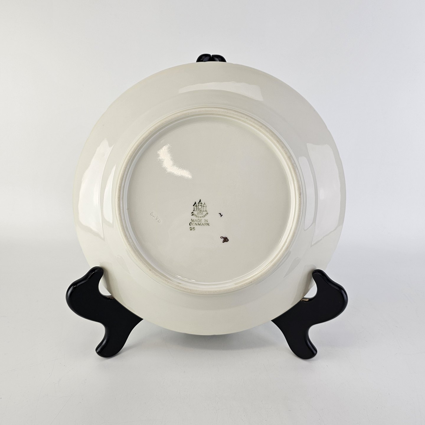 Balder er cremefarvet porcelæn i skælform, dekoreret med hyben og guldkant.