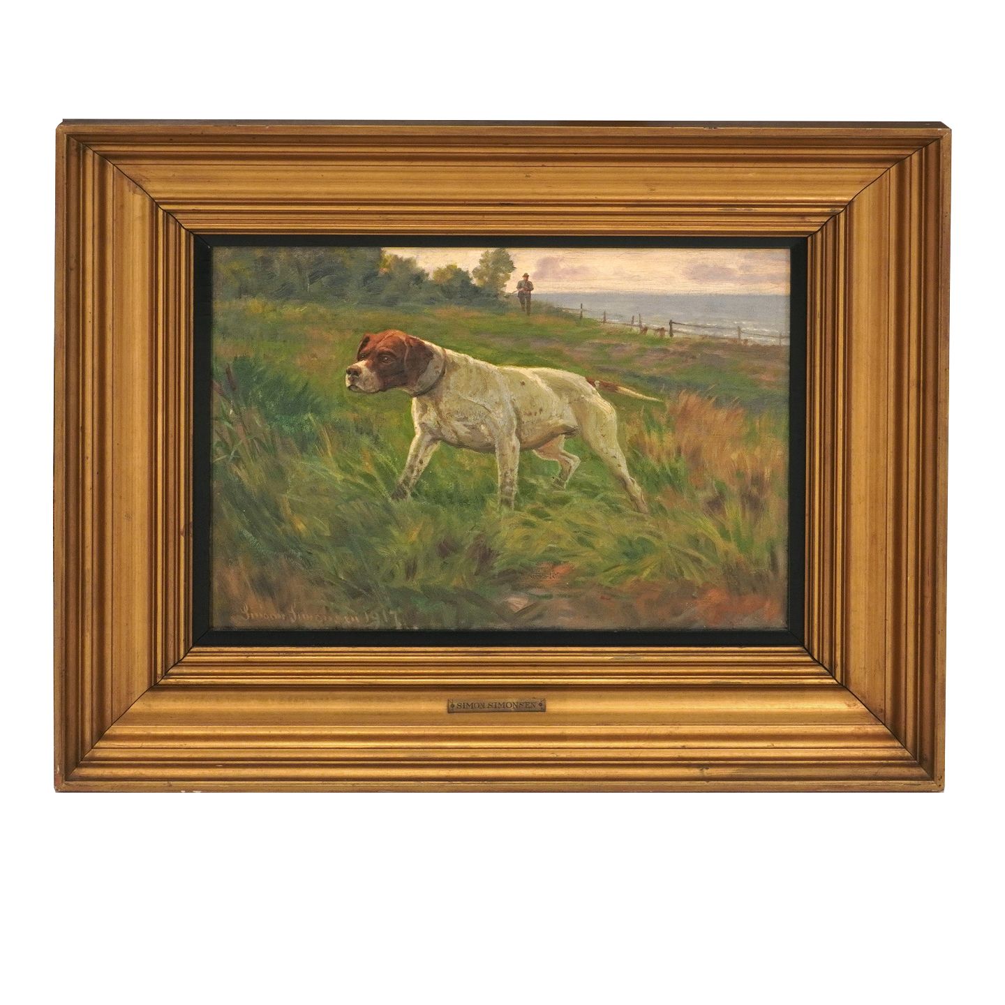 Simon Simonsen, 1841-1928, Öl auf Leinen. Pointer mit Jäger. Signiert und datiert 1917. Lichtmasse: 23x32cm. Mit Rahmen: 39x48cm |
