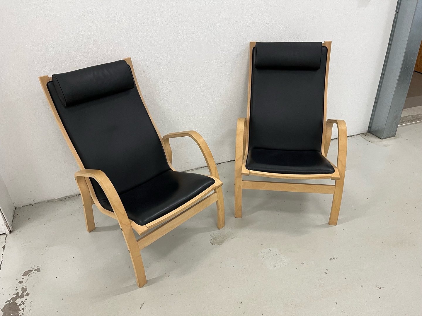 Finn østergaard Stühle in schwarzem Handschuhleder und mit einem Rahmen aus seifenbehandelter Buche. Neupreis 15.600,-