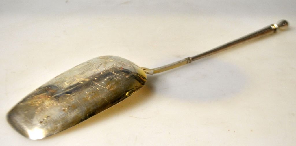 Dänischer Erdbeerlöffel mit Meisterstempel, 19. Jahrhundert. Vergoldet und mit Erdbeeren graviert. Glatter Griff. Unklarer Meisterstempel. L 28 cm.