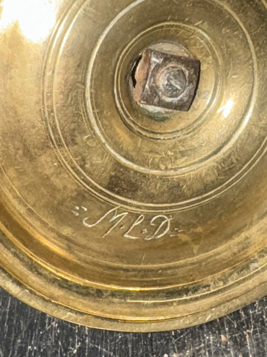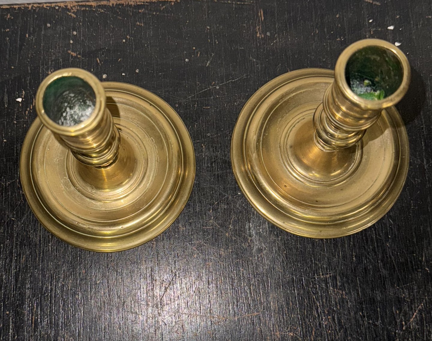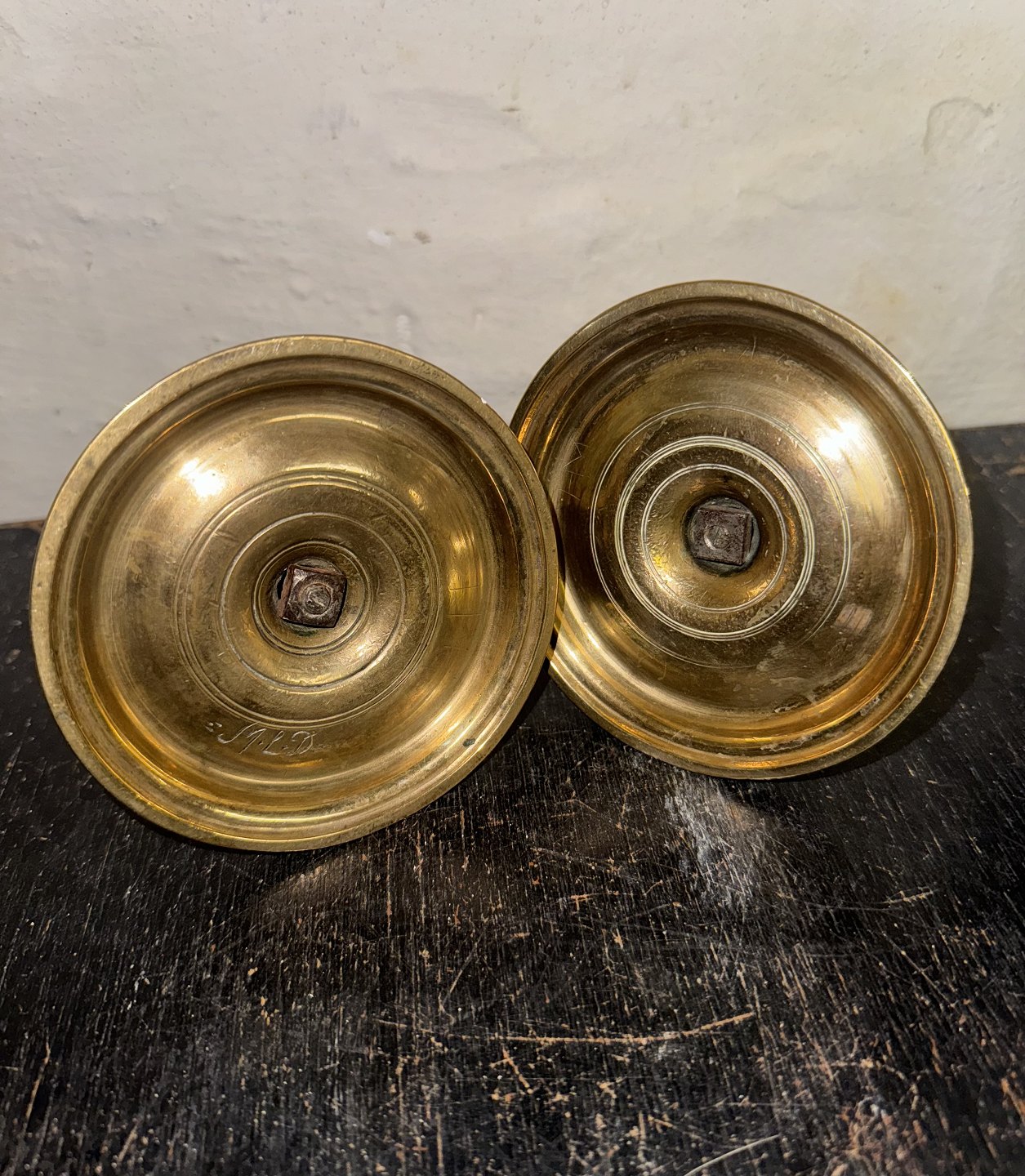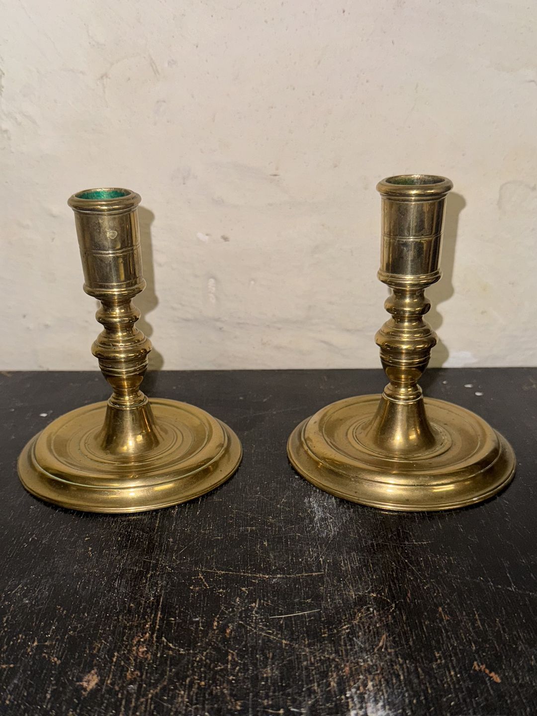 Par lave lysestager i messing fra anden halvdel af 1700-tallet (18. Århundrede). Fremstår i perfekt stand. Den ene graveret på bunden med initialerne MLD. Mål: H. 12,5 cm bundens diameter er 10,5 cm