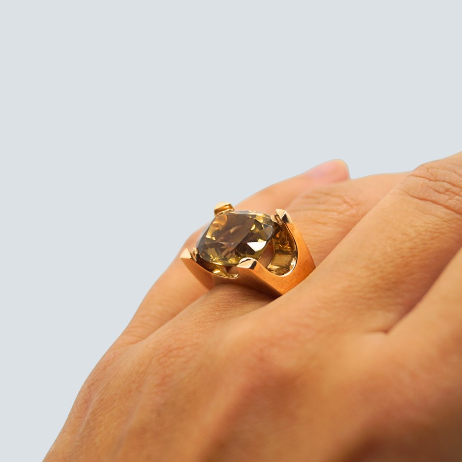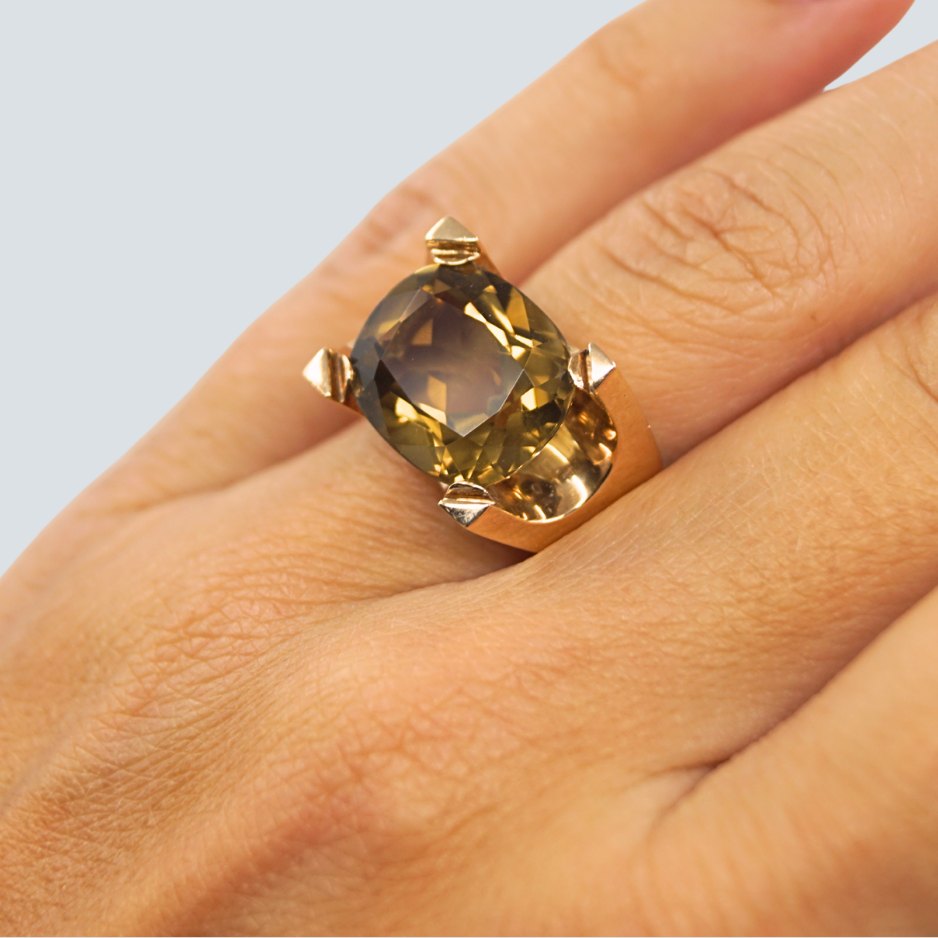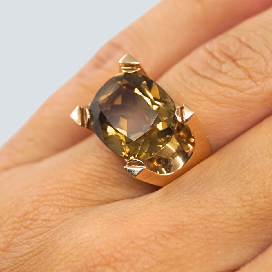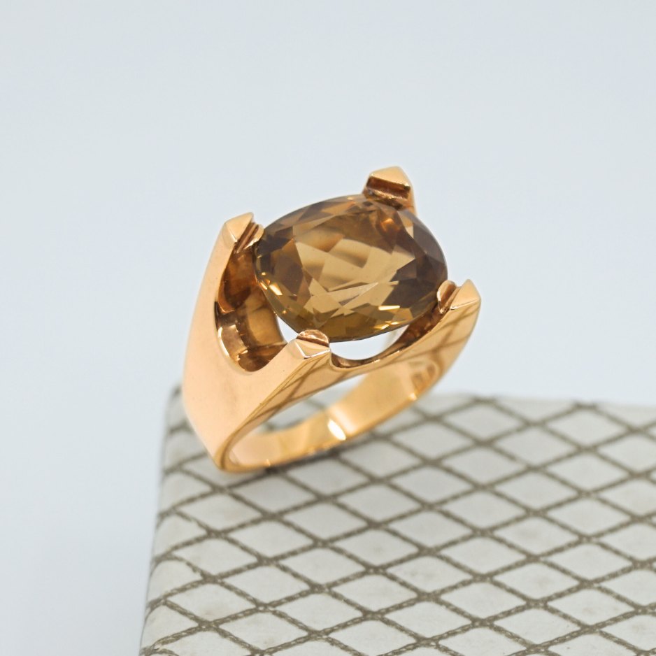 Text zugänglich auf Dänische: Just Andersen; Ring i 14 kt. guld, prydet med en stor topas.