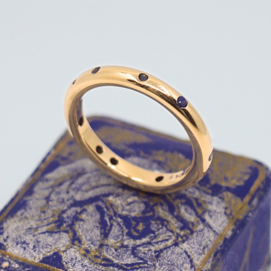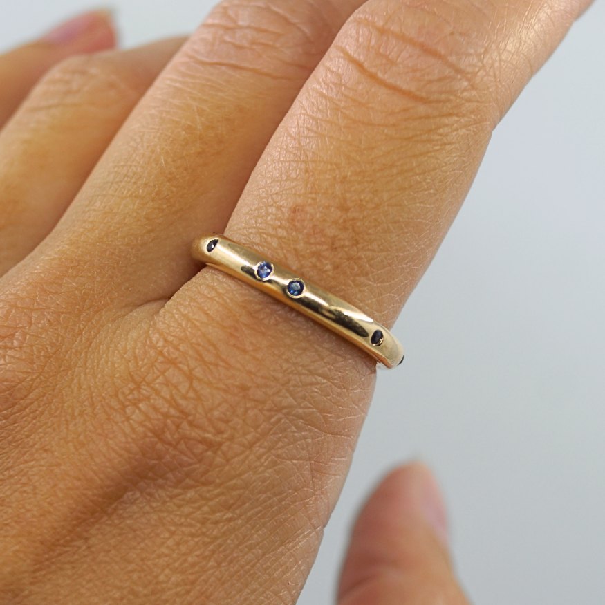Text zugänglich auf Dänische: Carl Antonsen; Ring i 14 kt. guld, prydet med safirer Ring str. 58. Stemplet "CA 585".