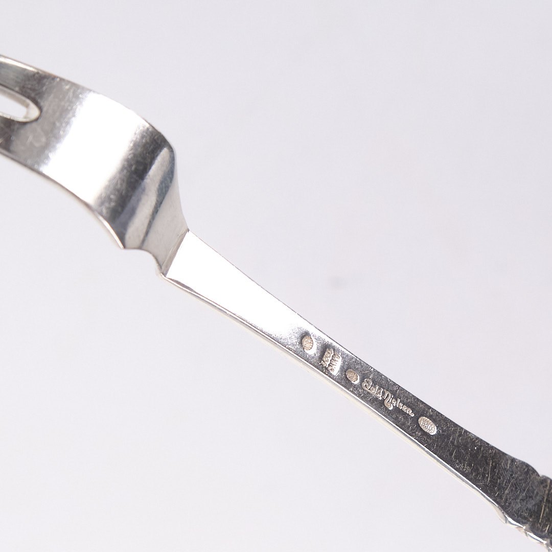 Text zugänglich auf Dänische: Stegegaffel i mønster nr. 13 af Evald Nielsen. Tretårnet sølv, stemplet. Klassisk dansk sølvdesign i tidløs kvalitet.