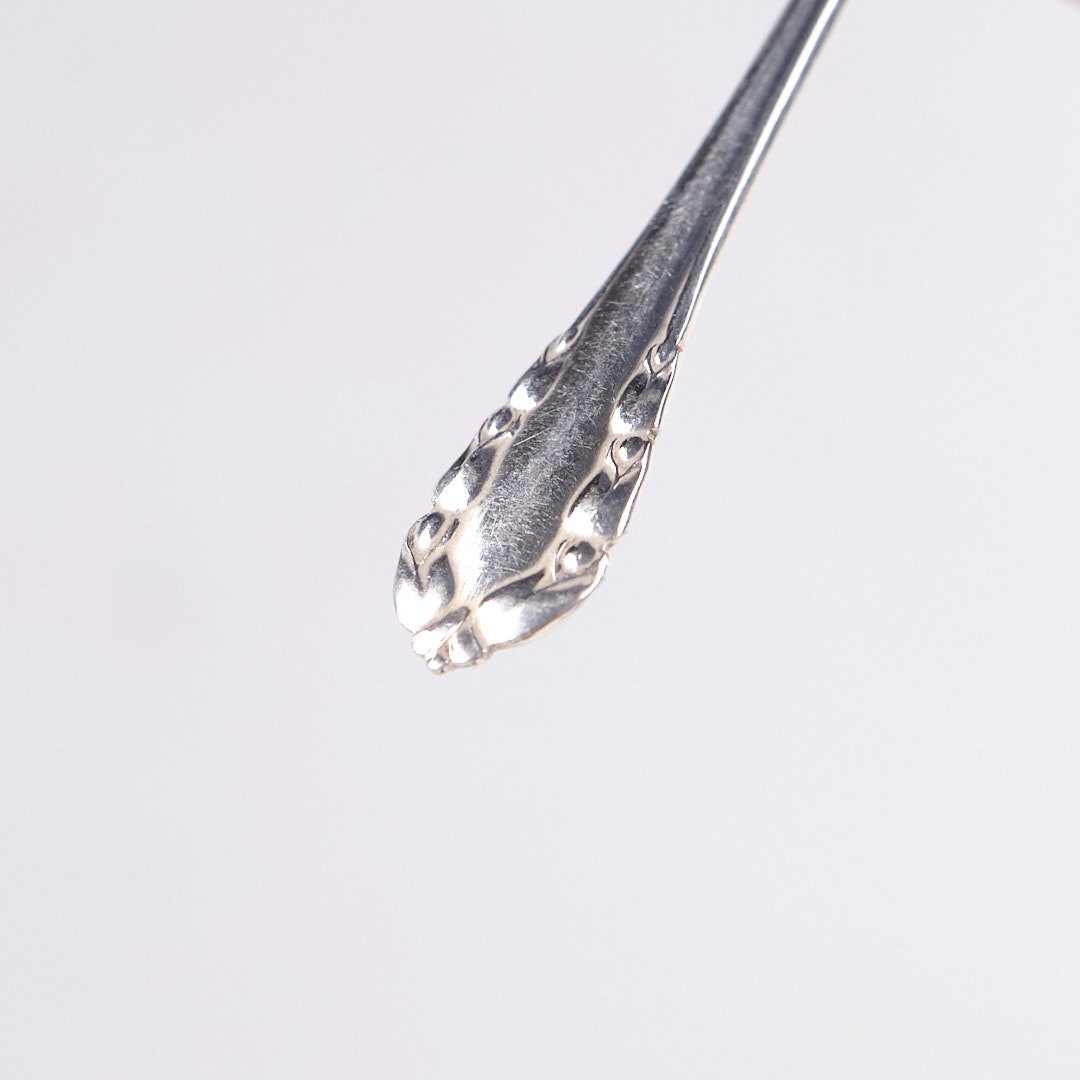 Text zugänglich auf Dänische: Saltske i sølv fra Georg Jensen, udført i det elegante Liljekonval (Lily of the Valley) mønster. Skeen er stemplet og udformet med bløde linjer og naturlige blomsterdetaljer, der kendetegner Georg Jensens organiske designstil.