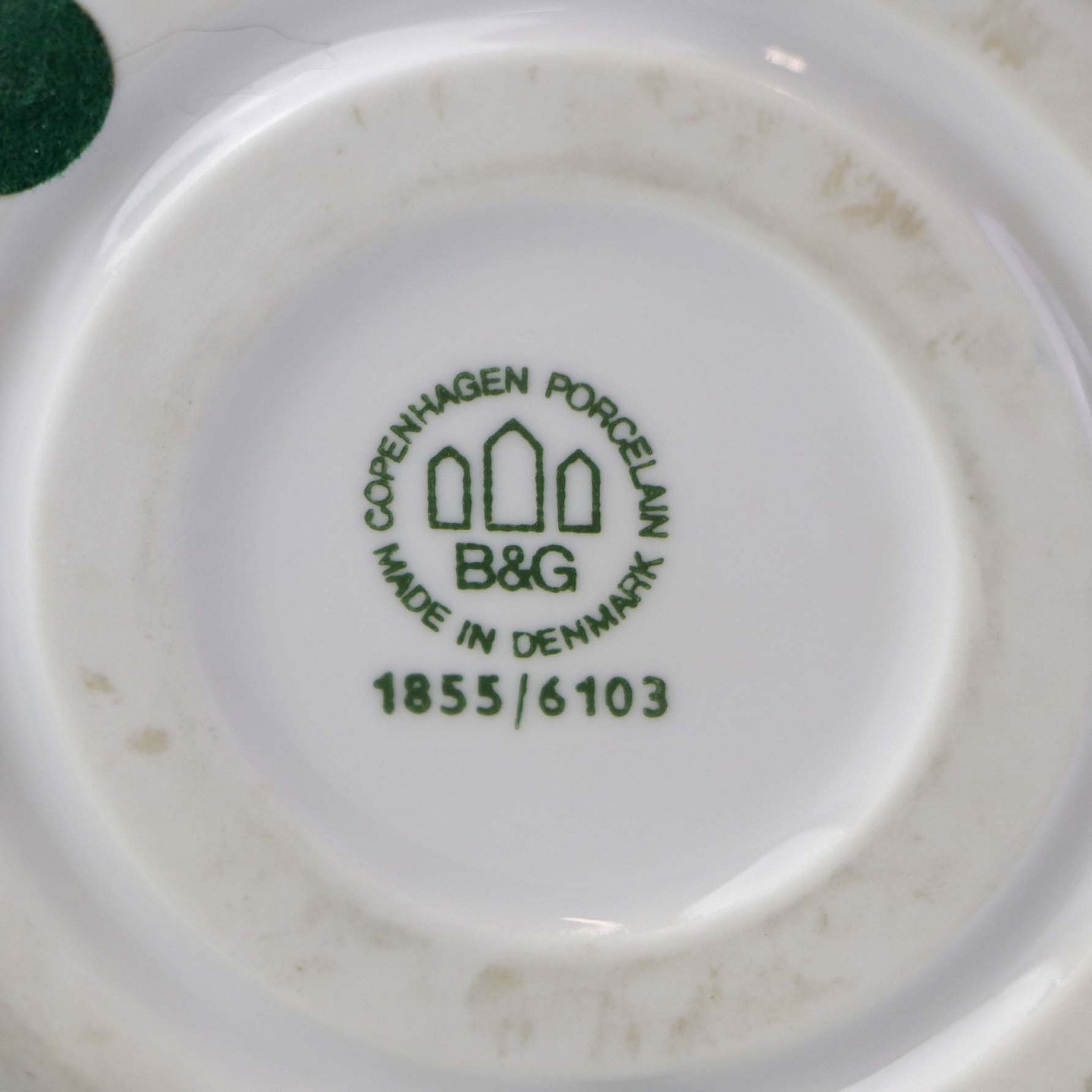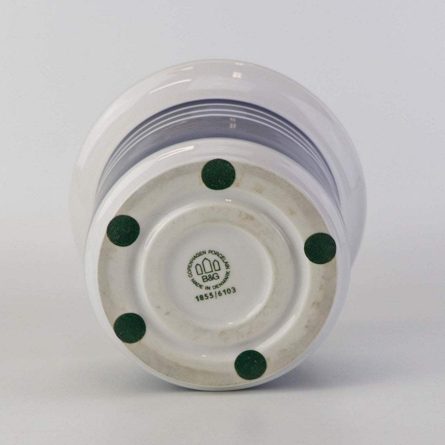 Mellemstørrelse urtepotteskjuler i glat hvidt porcelæn dekoreret med blå striber. Nr. 1855/6103