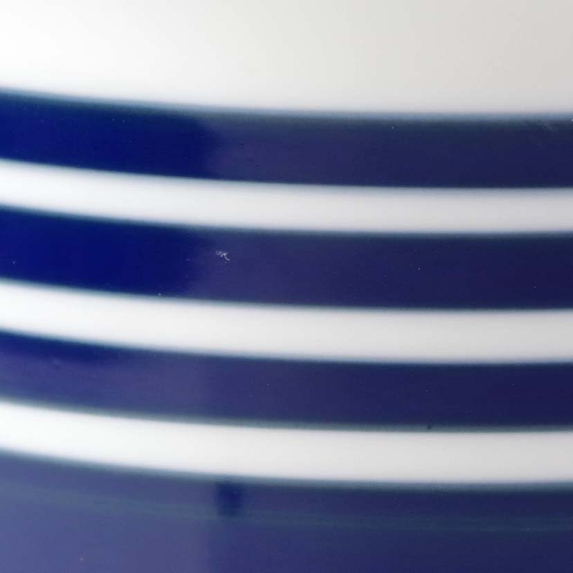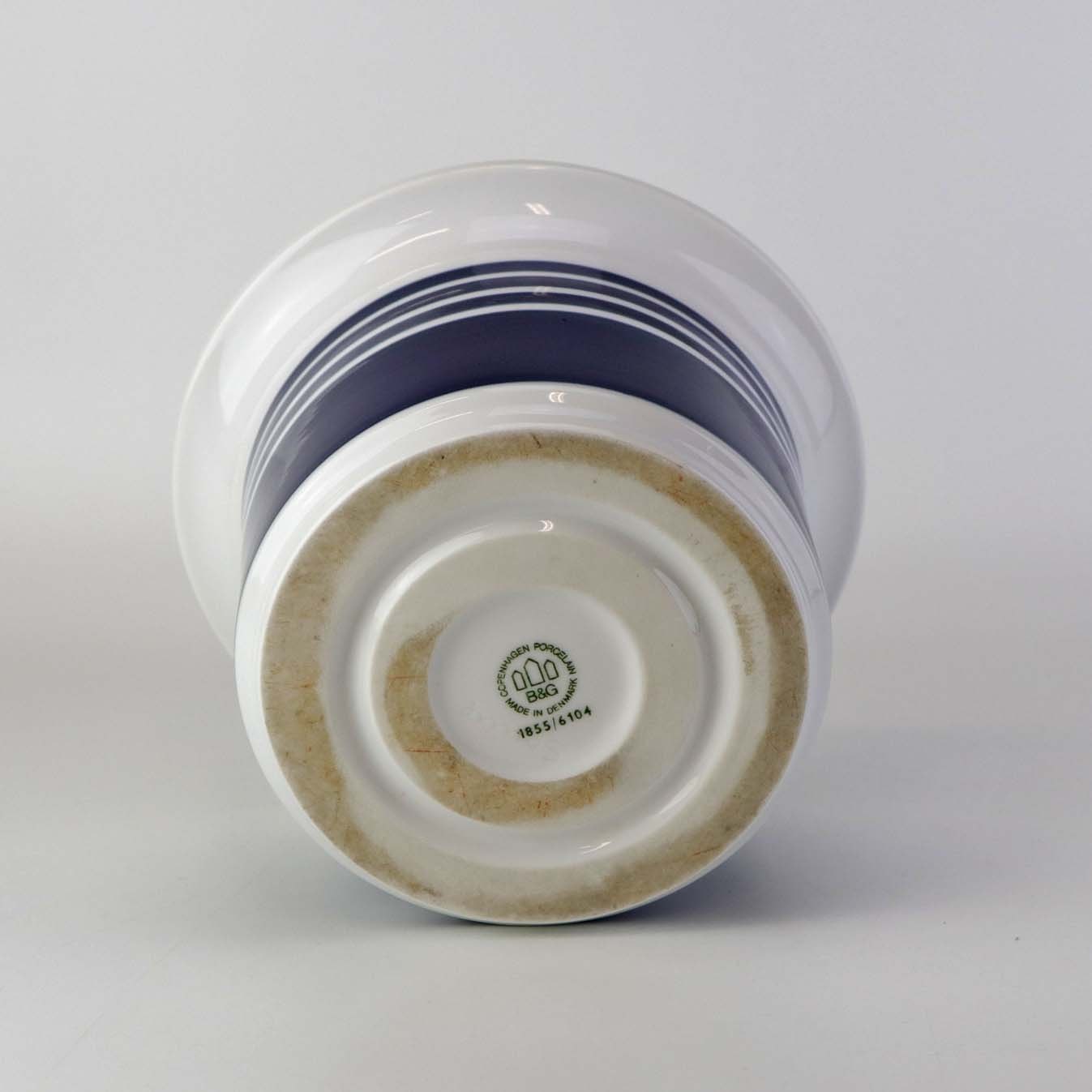 Urtepotteskjuler i glat hvidt porcelæn dekoreret med blå striber. Nr. 1855/6104