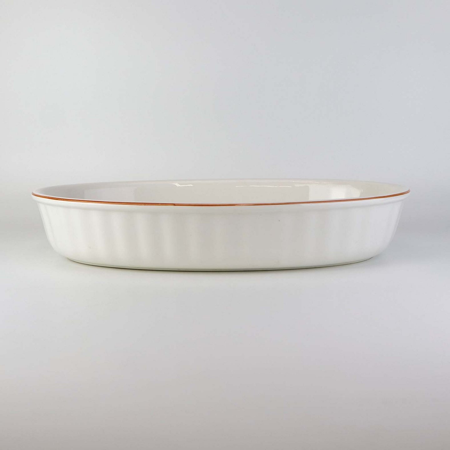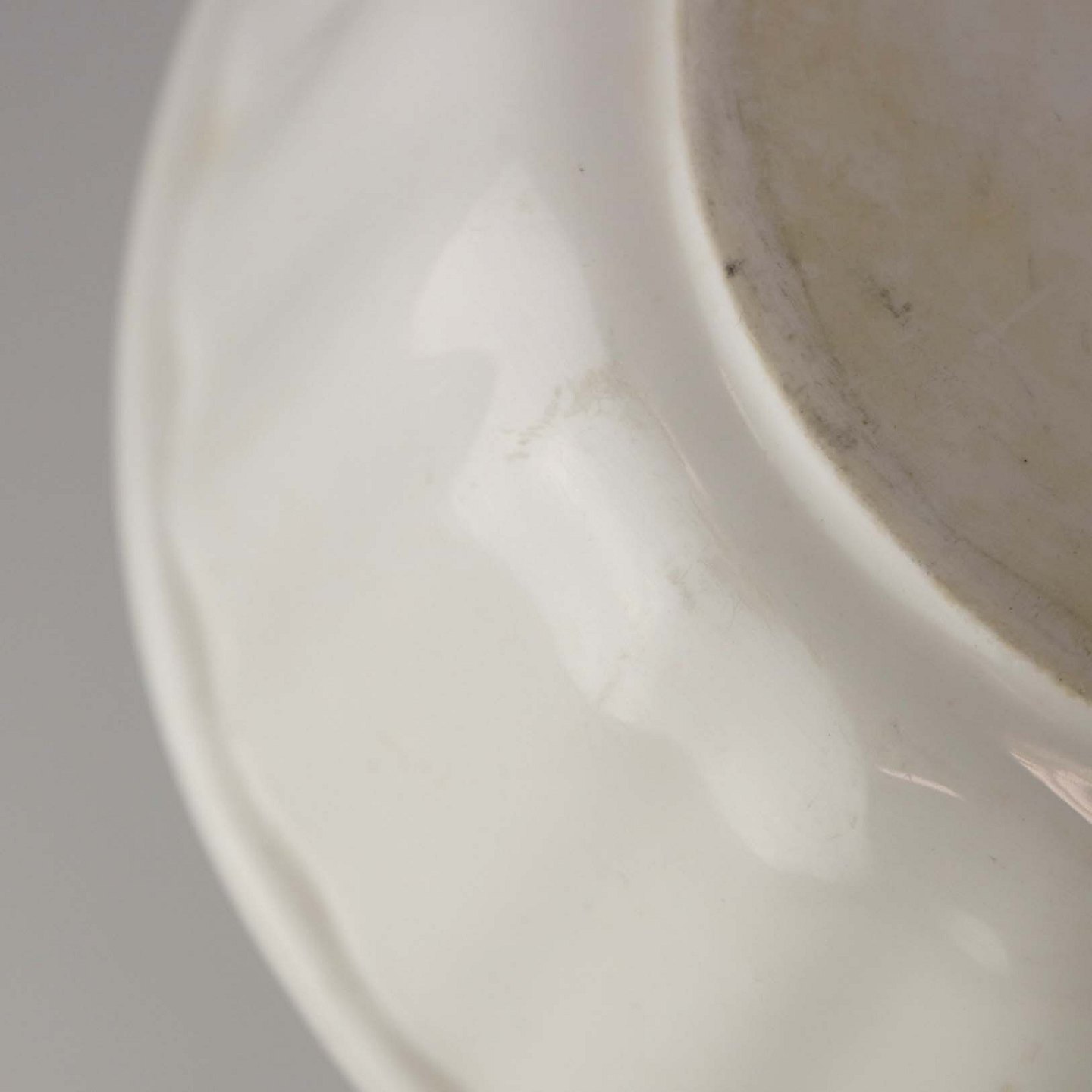 Fremstår med med mindre brugsspor på topkanten og yderside samt overfladiske ridser i fadets bund.