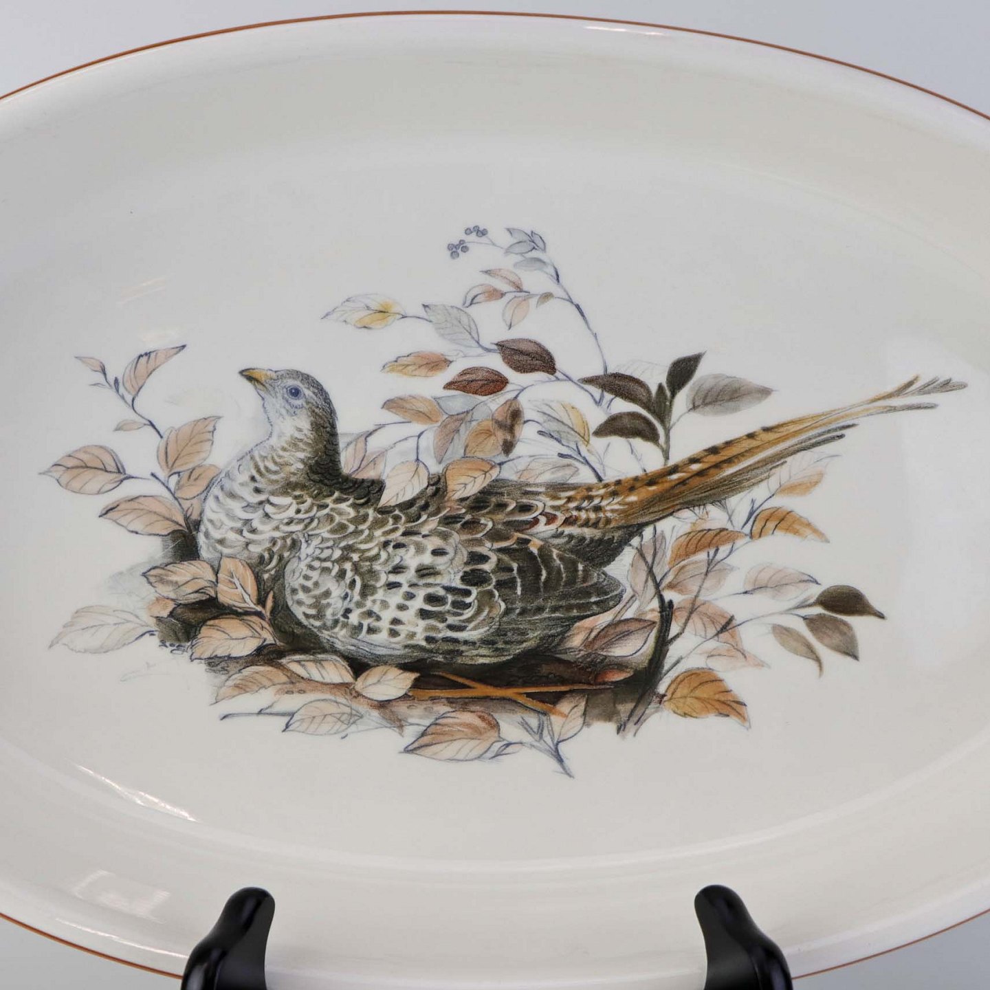 Text zugänglich auf Dänische: Ovalt ildfast fad i porcelæn med motiv af agerhøne på rede fra stellet Jagtstel. Nr. 2