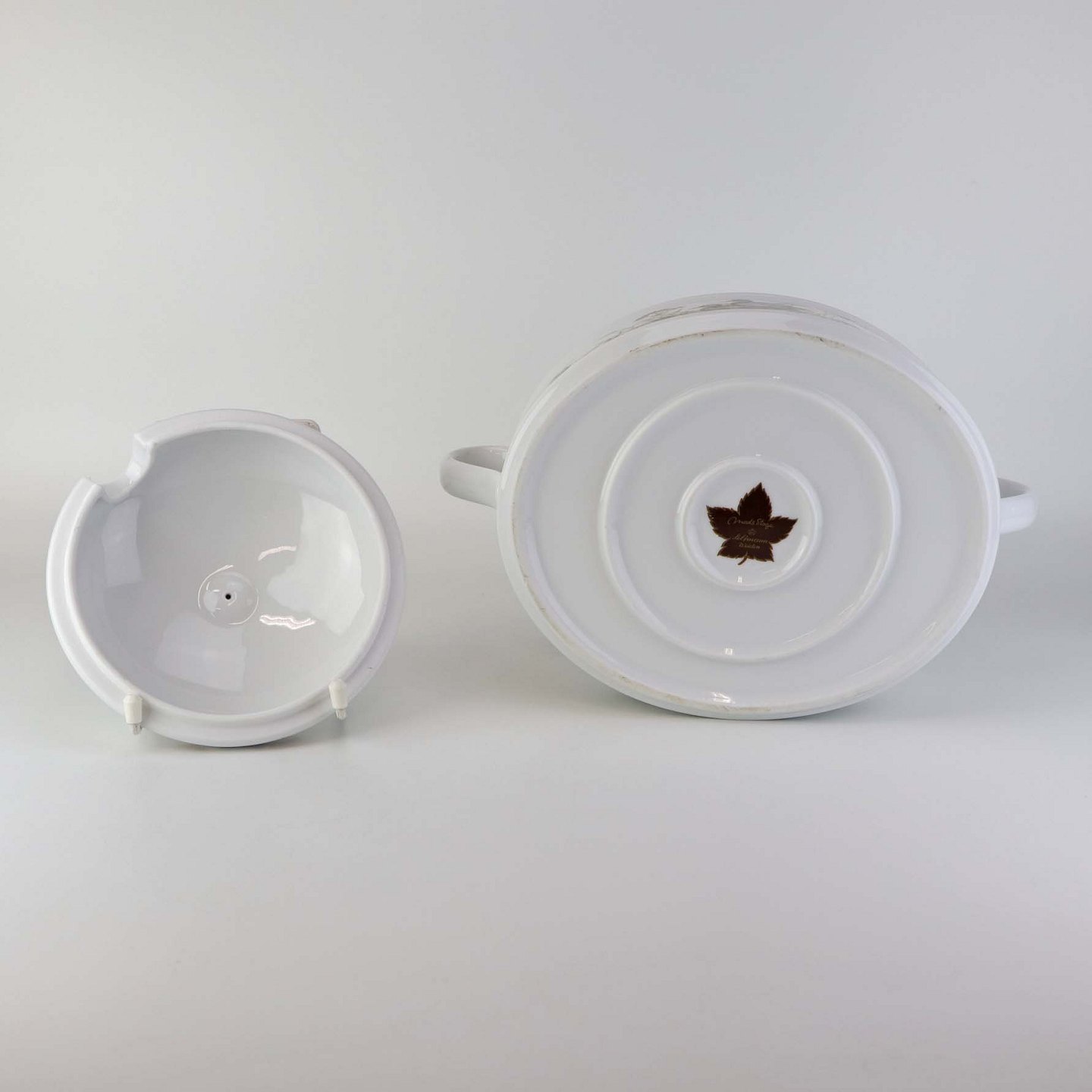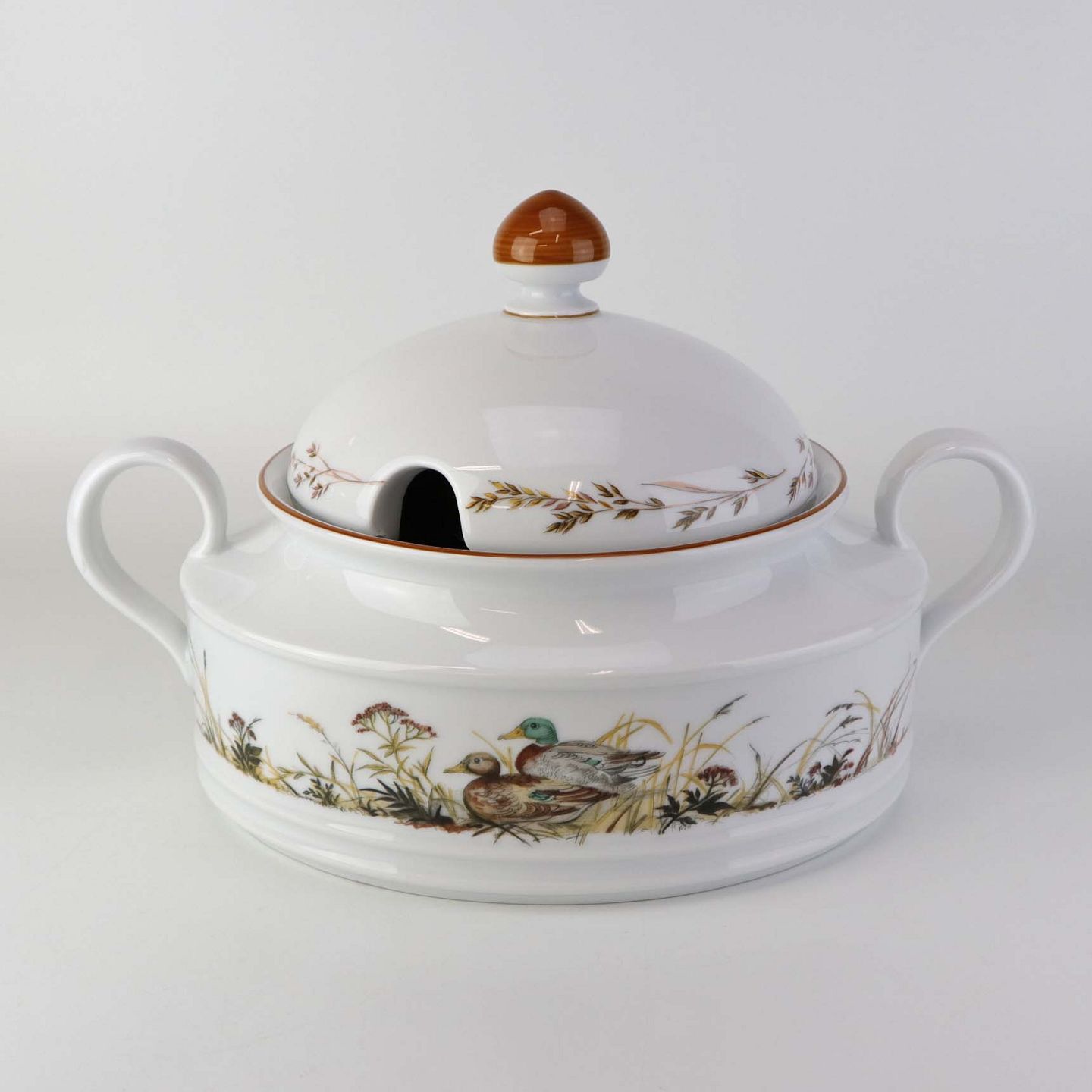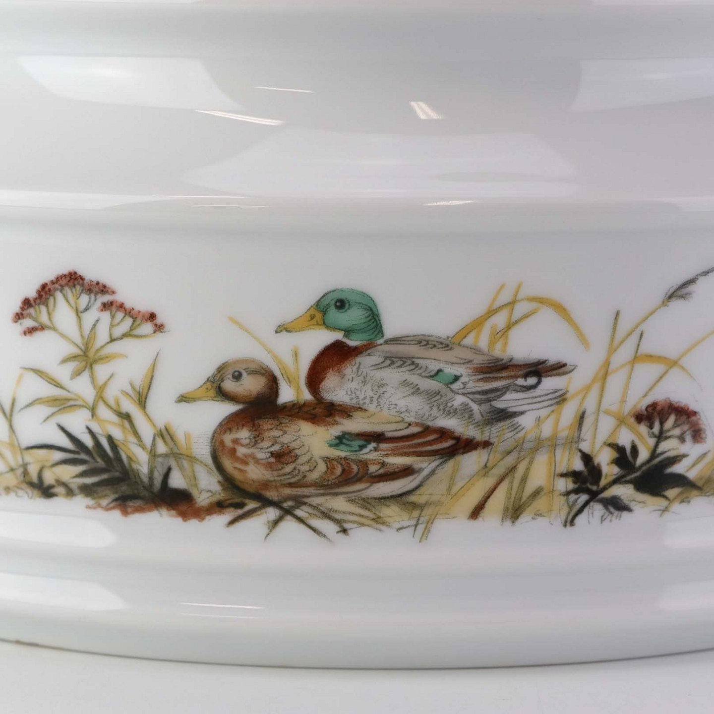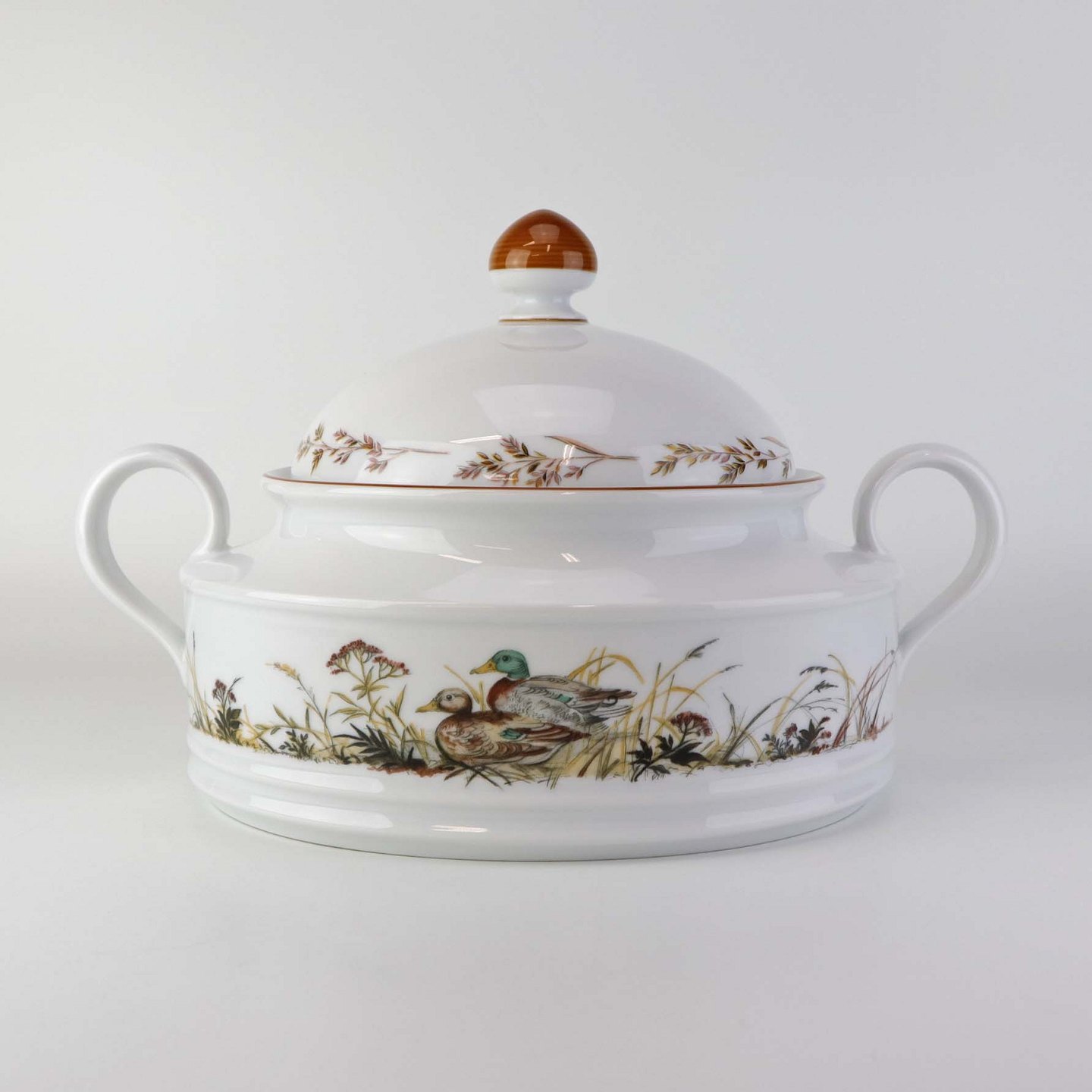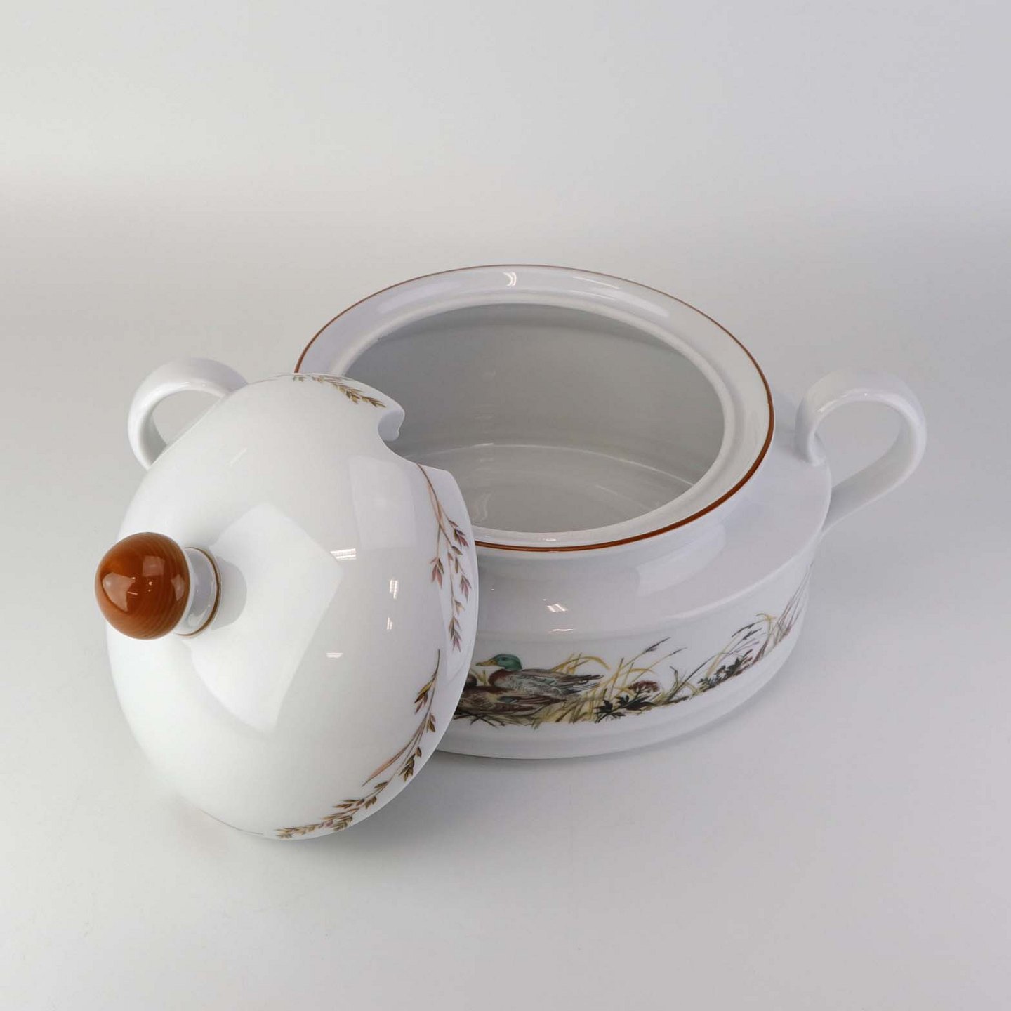 Text zugänglich auf Dänische: Ragout fad i porcelæn med låg og hanke, som er dekoreret med motiv af ænder fra stellet Jagtstel.