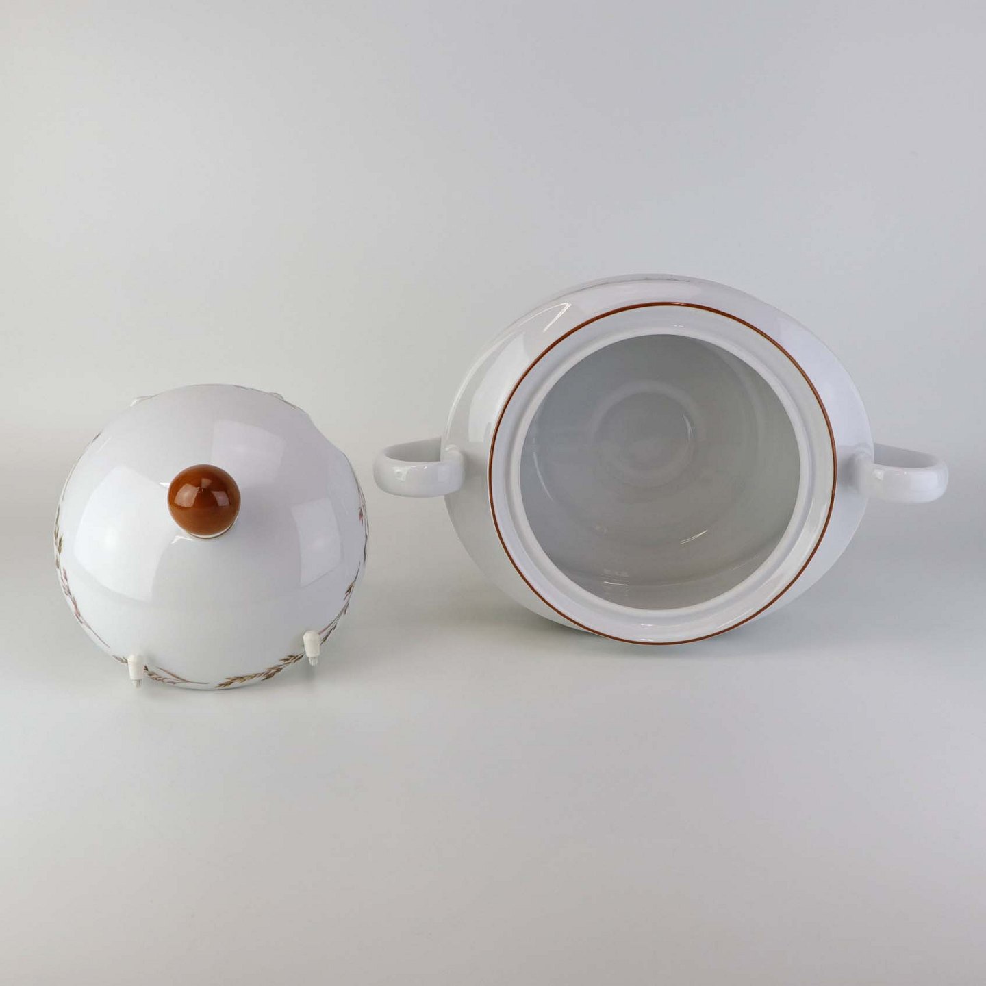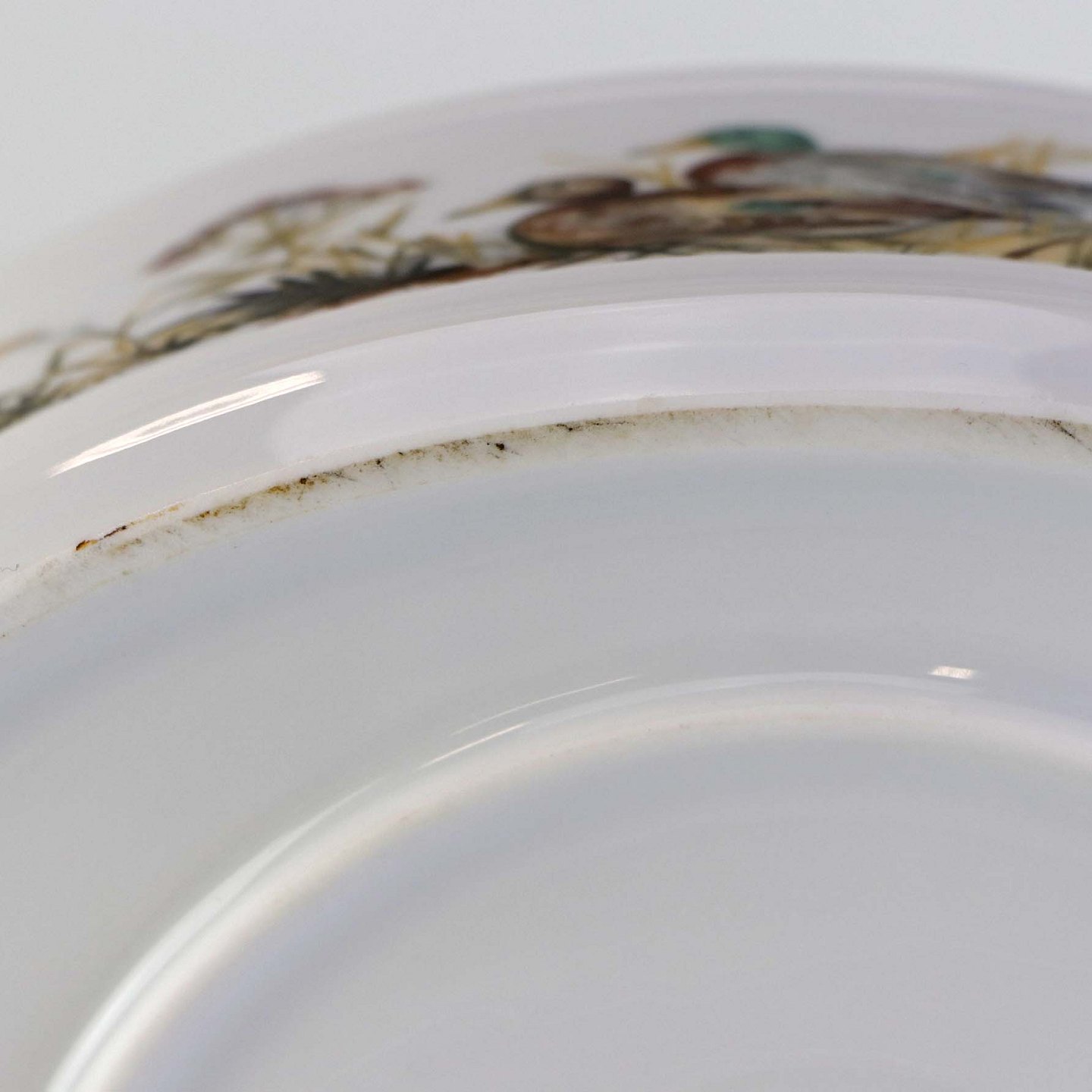 Jagtstellet er i glat hvidt porcelæn med gyldenbrun kantdekoration og motiver af forskellige vilde danske dyr i deres naturlige miljø. Stellet er holdt i dæmpede varme efterårsfarver.