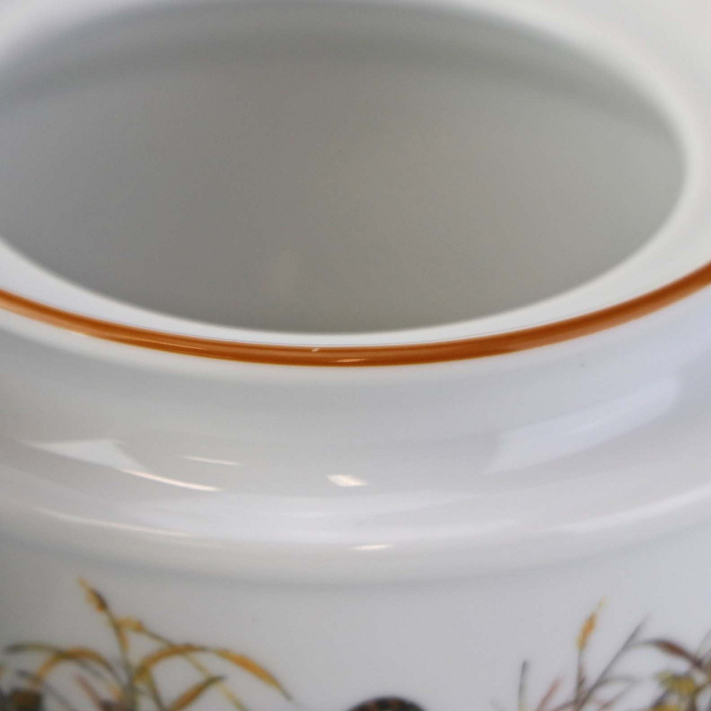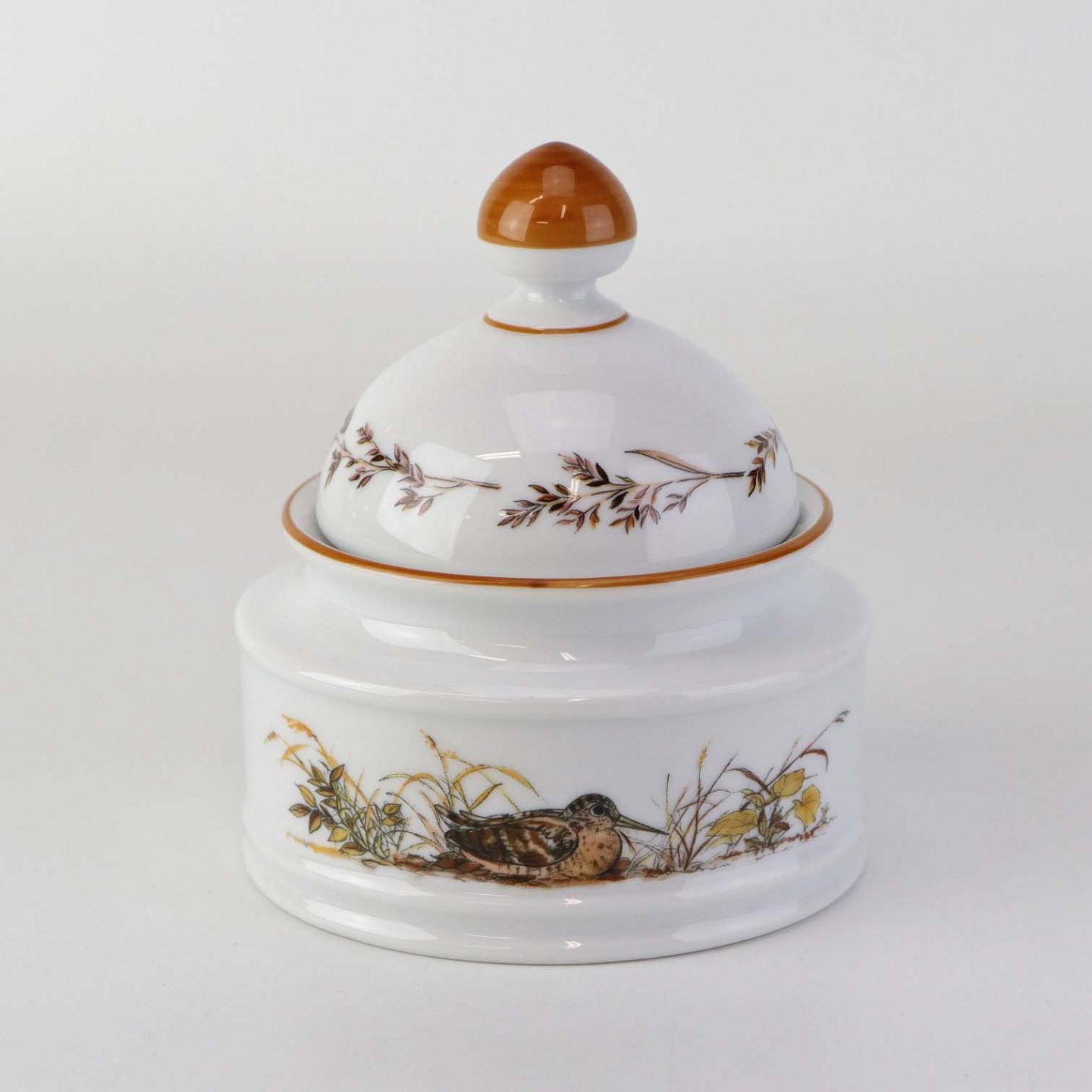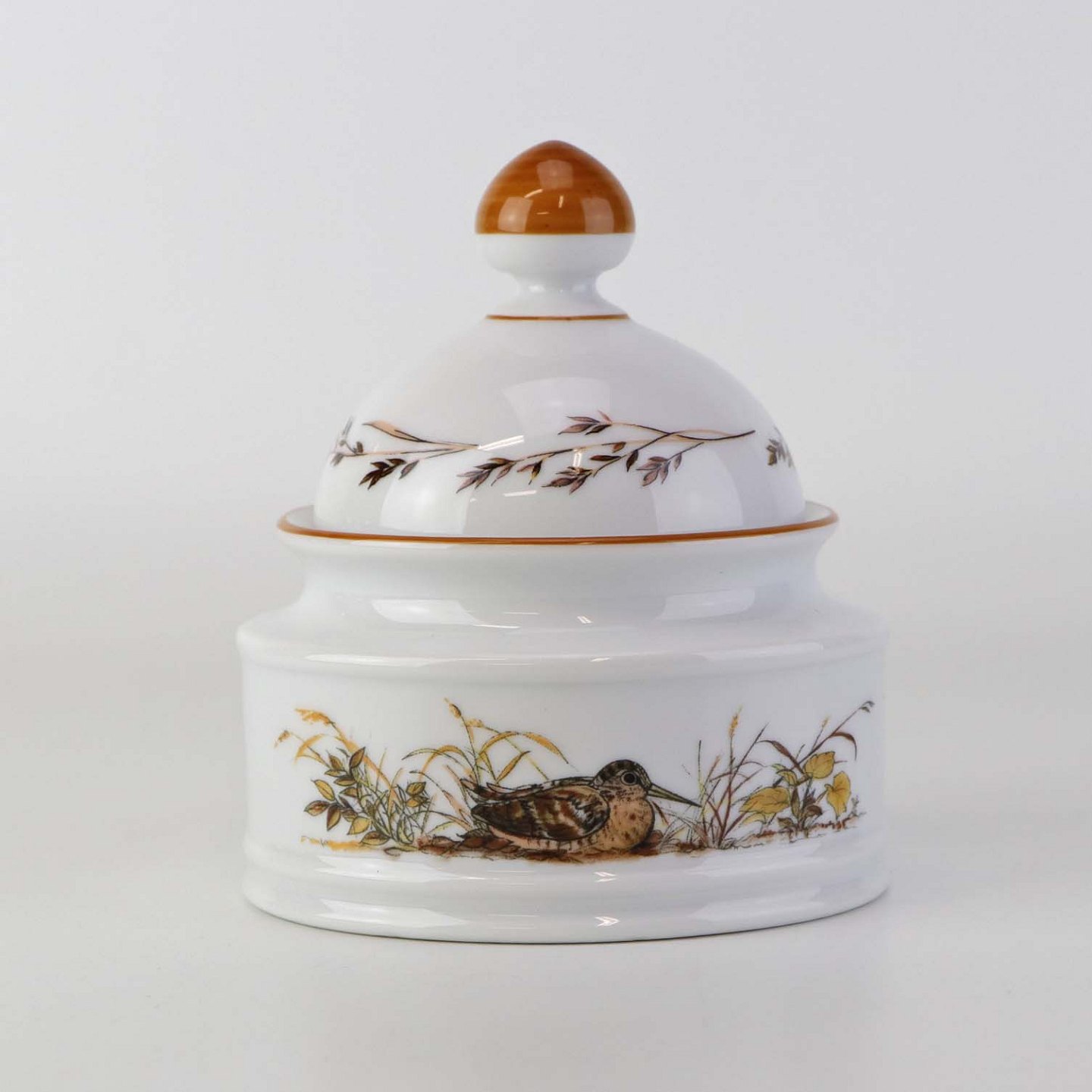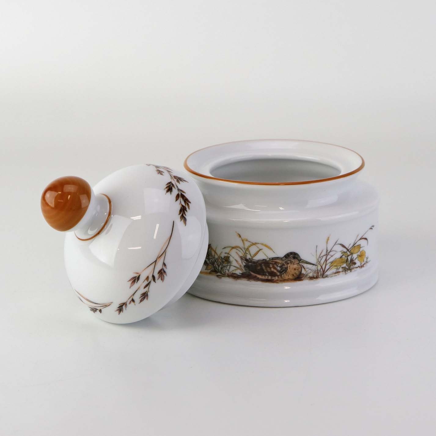 Text zugänglich auf Dänische: Lågkrukke til sukker i porcelæn med motiv af en sneppe fra stellet Jagtstel.