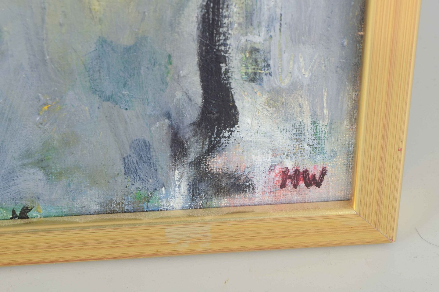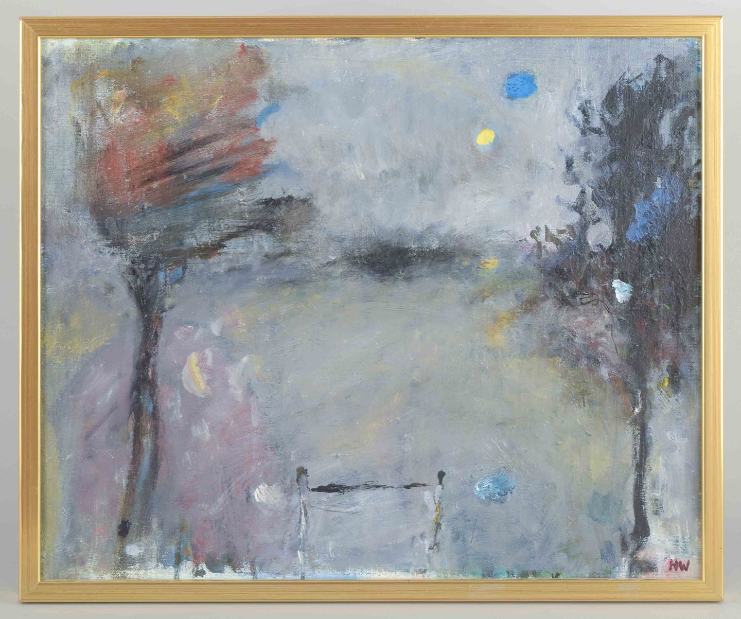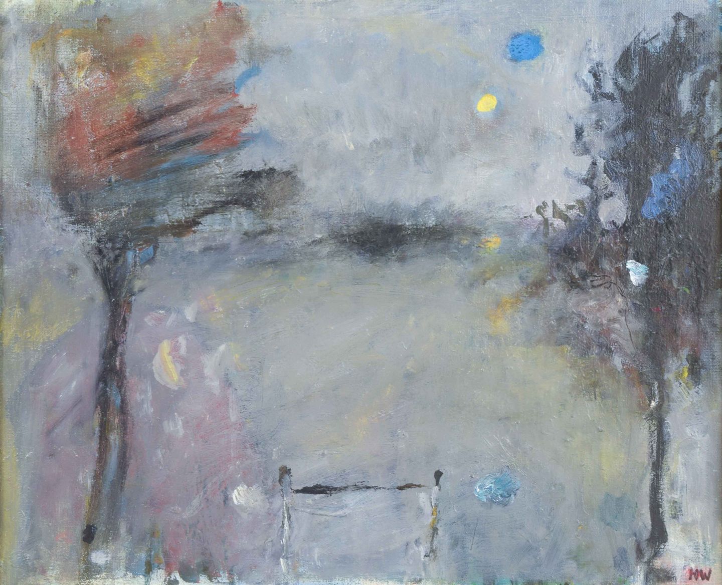 Et stemningsfuldt abstrakt maleri med suggestive træk, hvor en port i forgrunden åbner sig mod et tåget landskab. Farbepaletten domineres af dæmpede grå, blå og violette toner, med accenter af gult og rødt, der giver kompositionen en drømmeagtig og poetisk karakter.