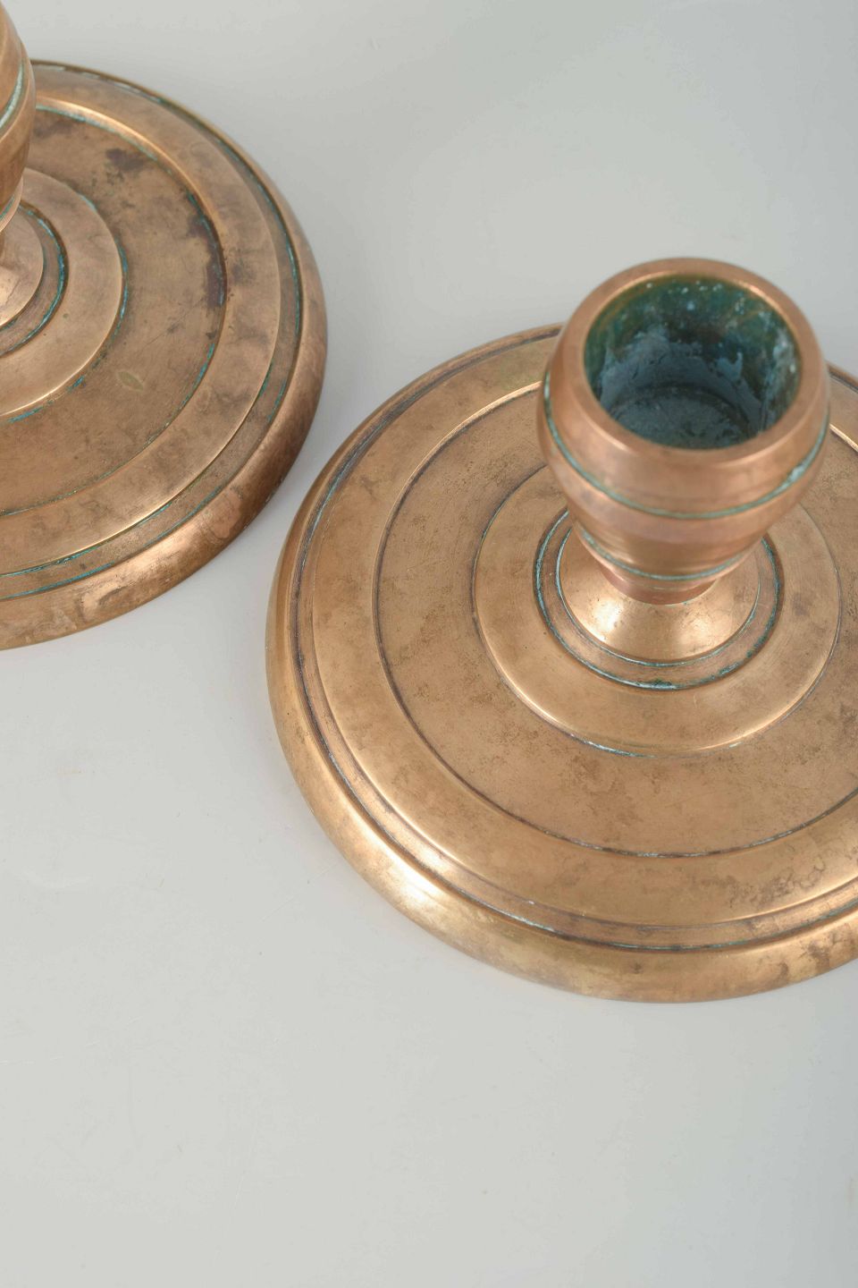 Massive messingstager med rund fod og geometriske ringdekorationer, typiske for perioden.