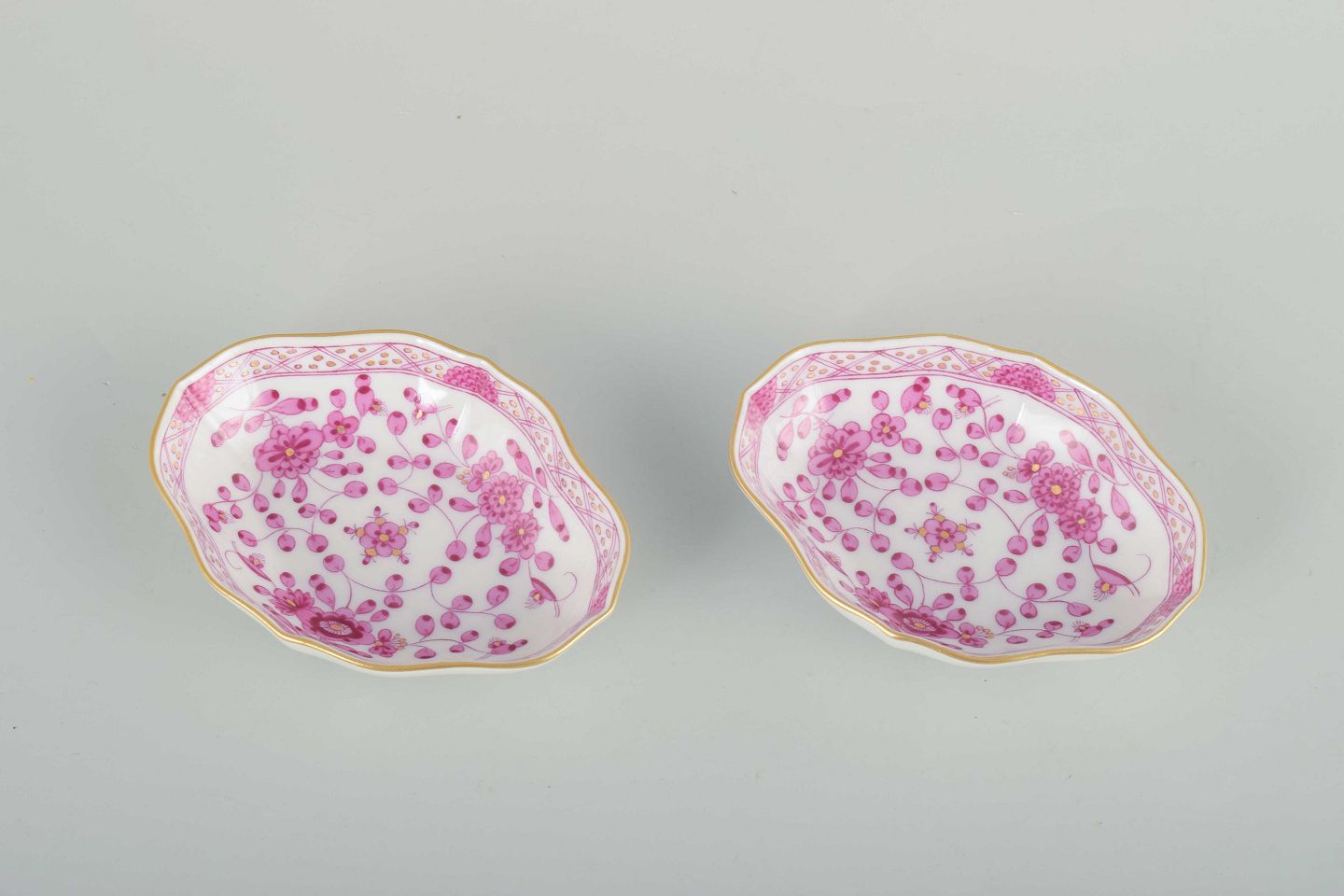 To ovale porcelænsskåle, håndmalet i det klassiske mønster "Pink Indian", dekoreret med rosa blomster og blade samt guldbemaling på kant.